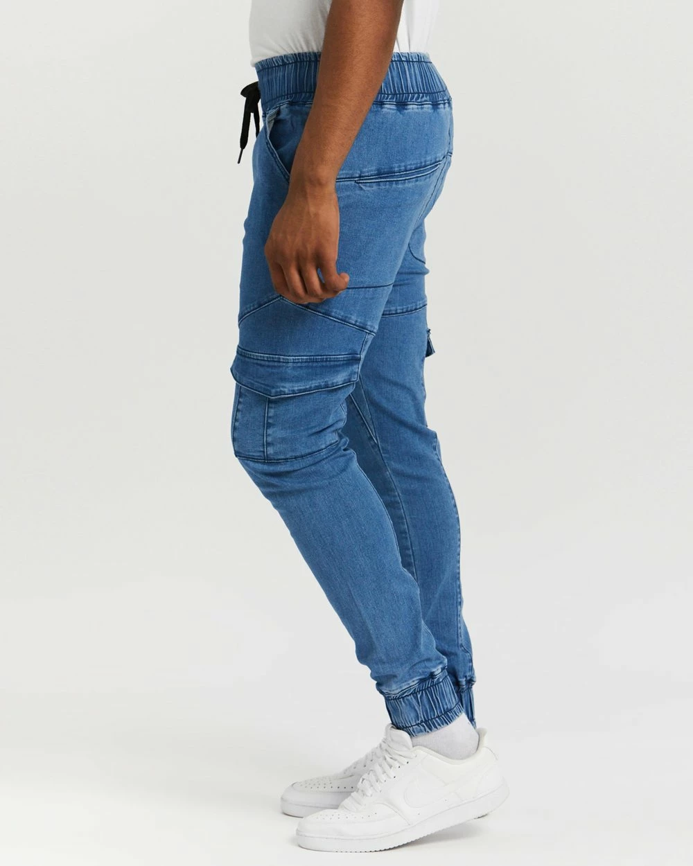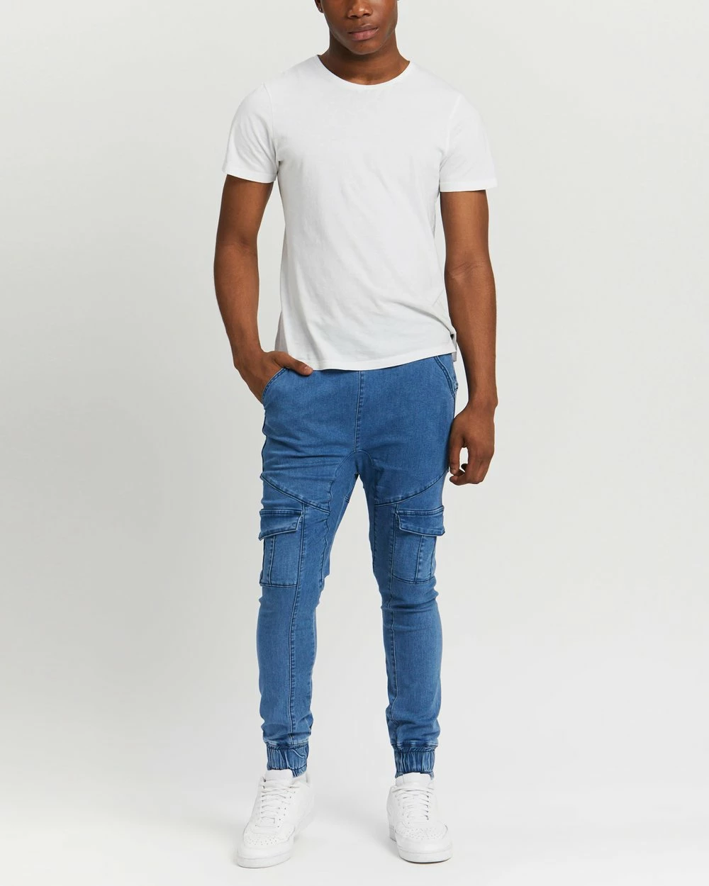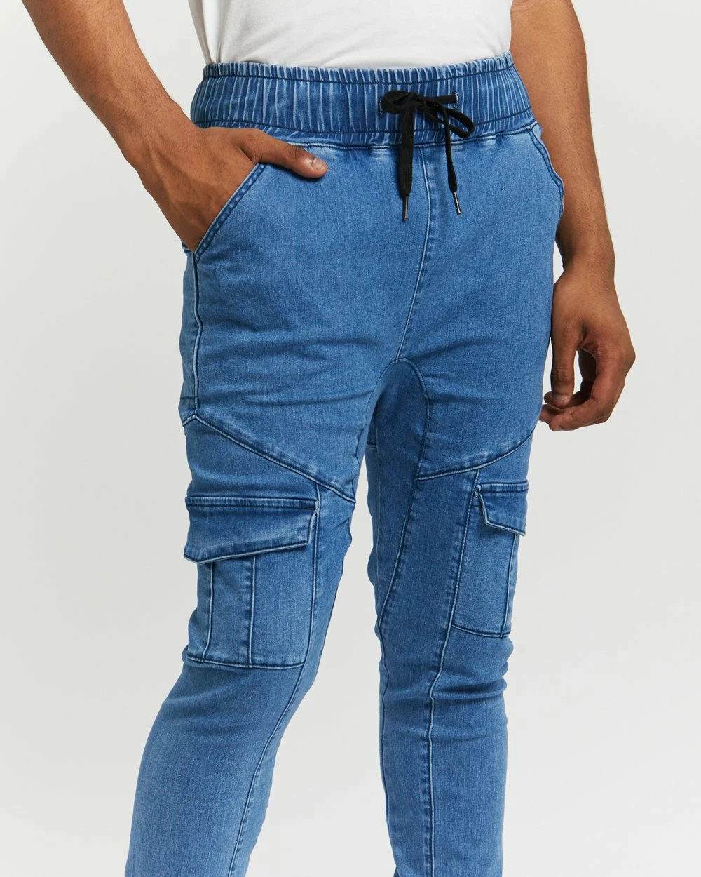 Skinny pants redefined with cargo pockets and elastic cuffs by Everloom, the Robbie Cargo Denim Joggers are perfect for an on-the-run day or lounging through the night.