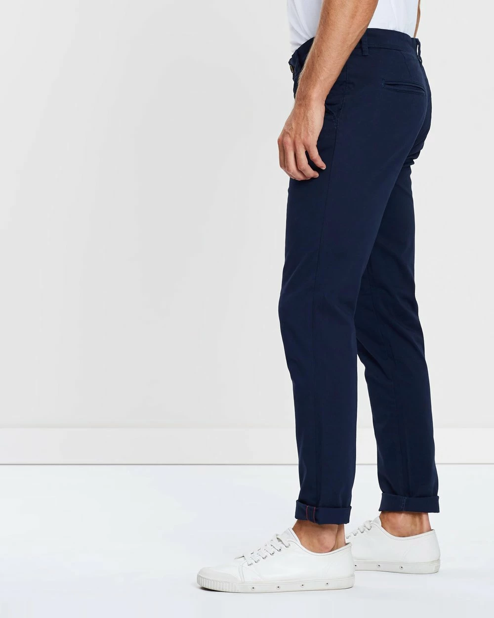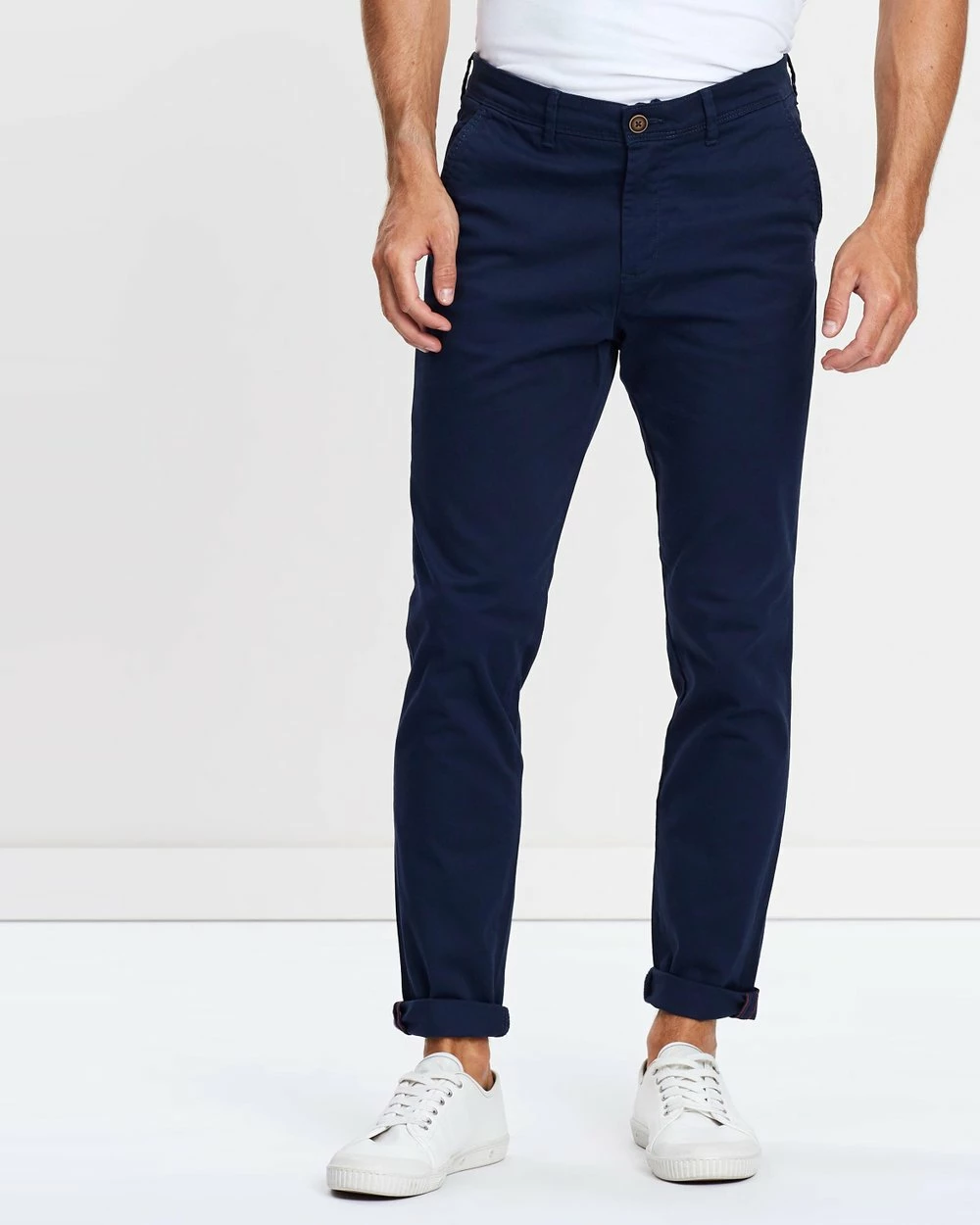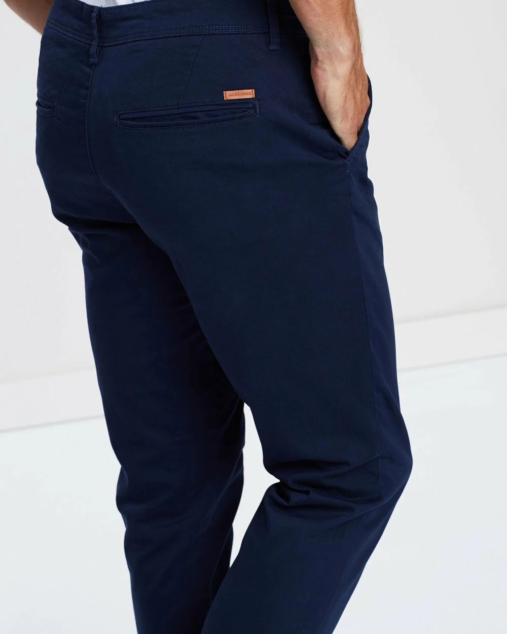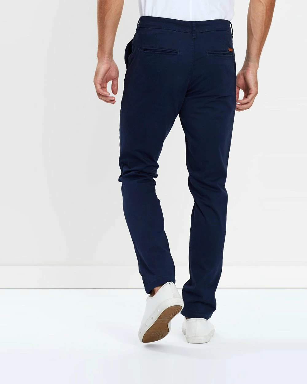 The Marco Bowie Slim Fit Chinos by Jack & Jones are cut from smooth, stretch cotton twill in a versatile deep navy hue, complete with streamlined slip pockets and a modern slim fit.