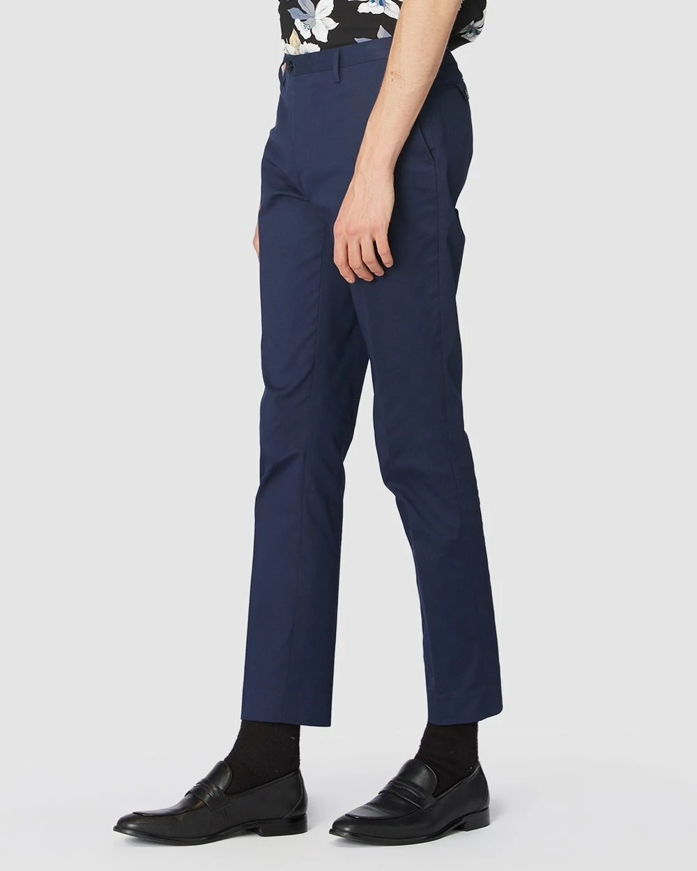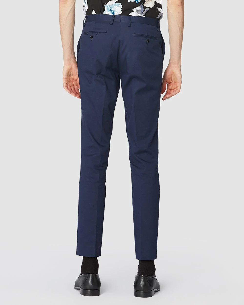 The Cobalt Dress Chinos by Jack London are cobalt coloured chinos. This pair of pants has a zip fly with button fastening, rear jet pockets, soft tonal lining, cuffed hems, and angled front pockets.