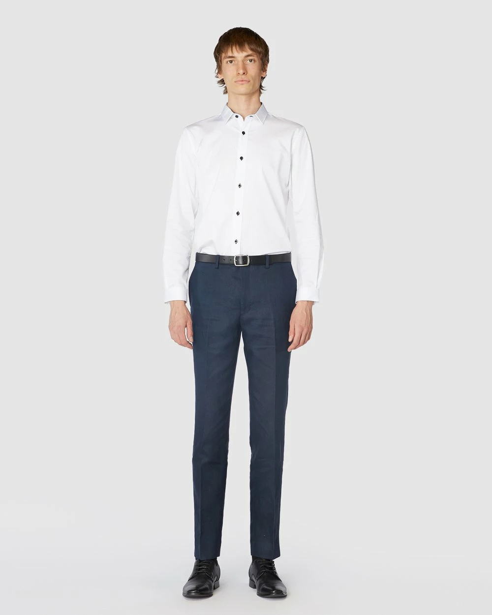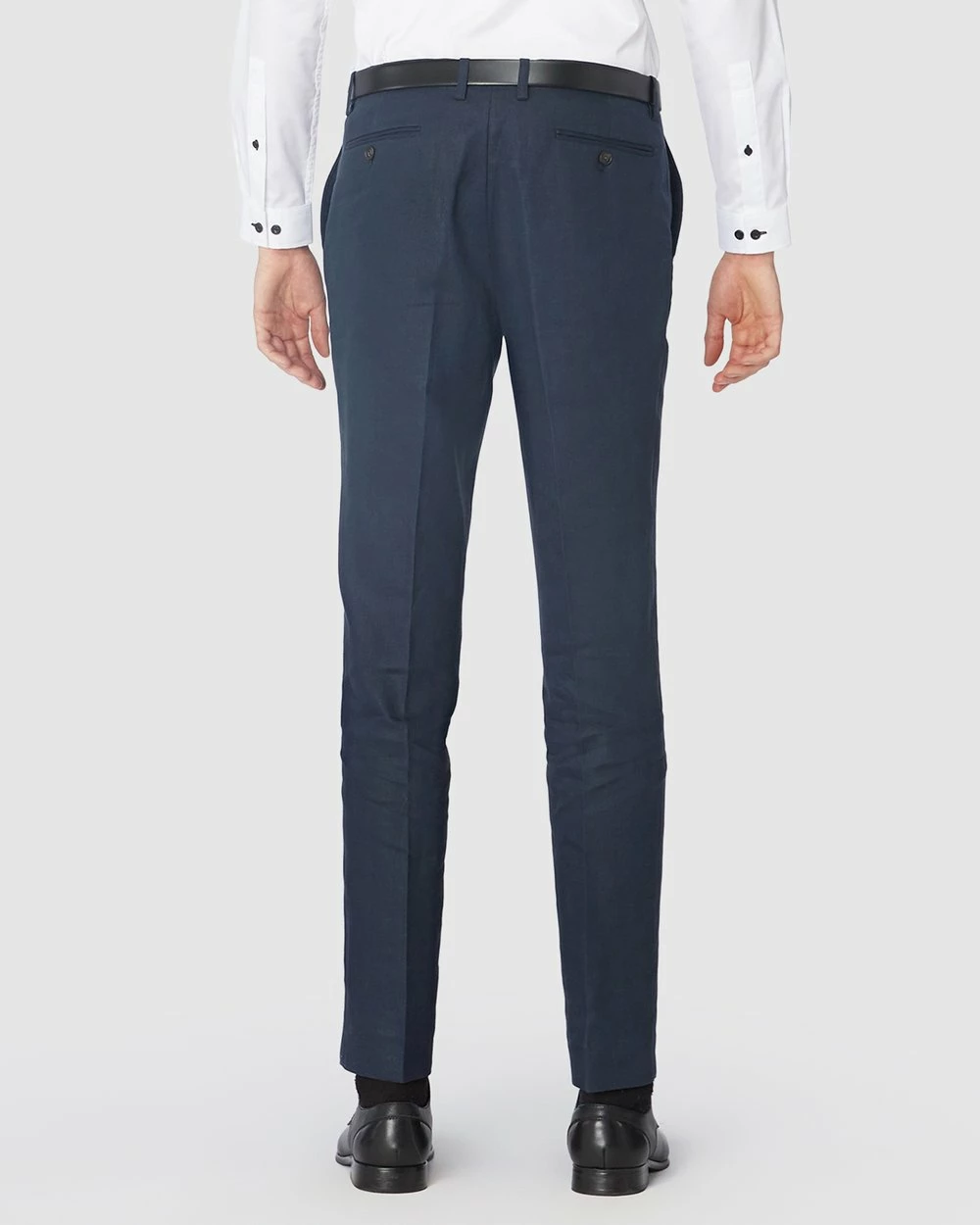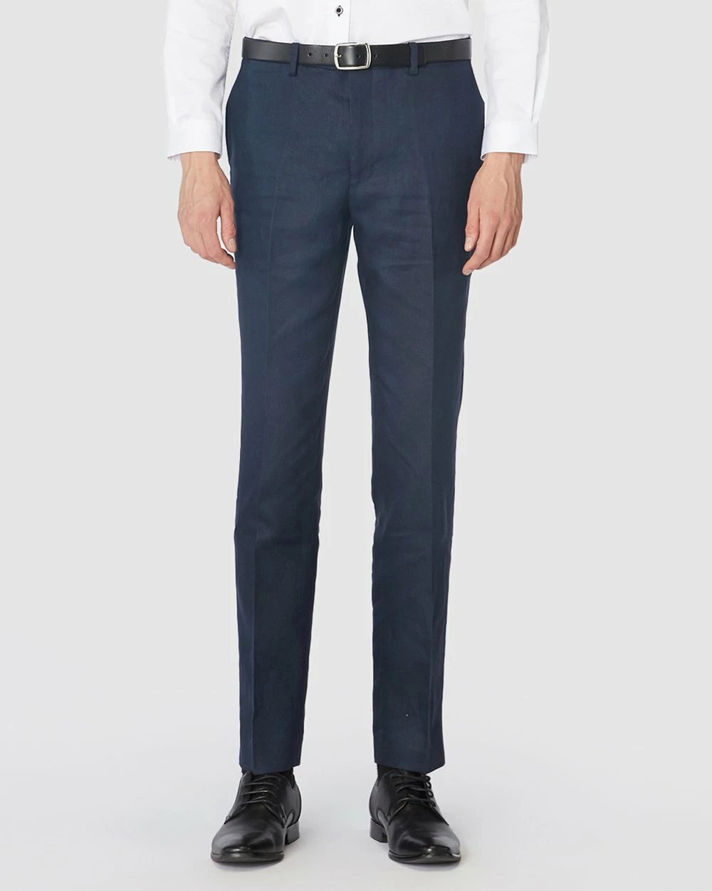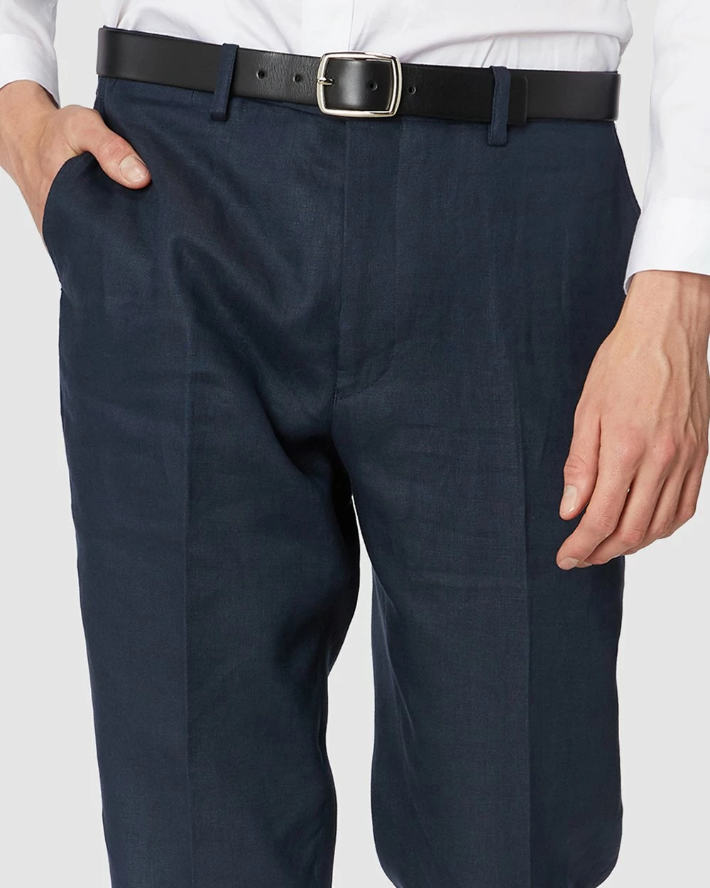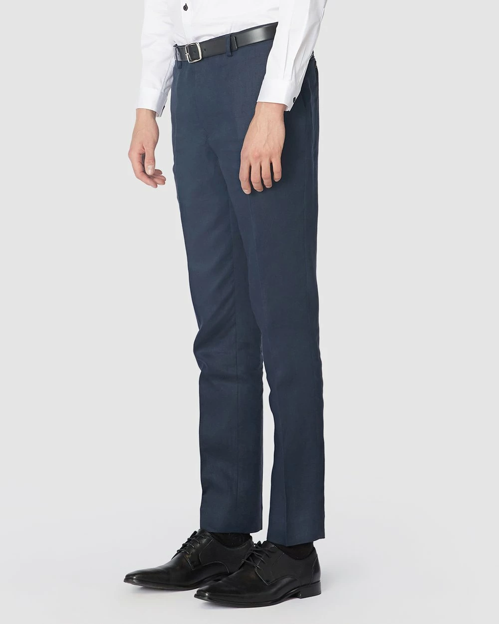 The Navy Linen Suit Pants by Jack London are trousers with a zip fly and button fastening. They feature rear jet pockets, finished hems, soft tonal lining, a slim fit, and angled front pockets.