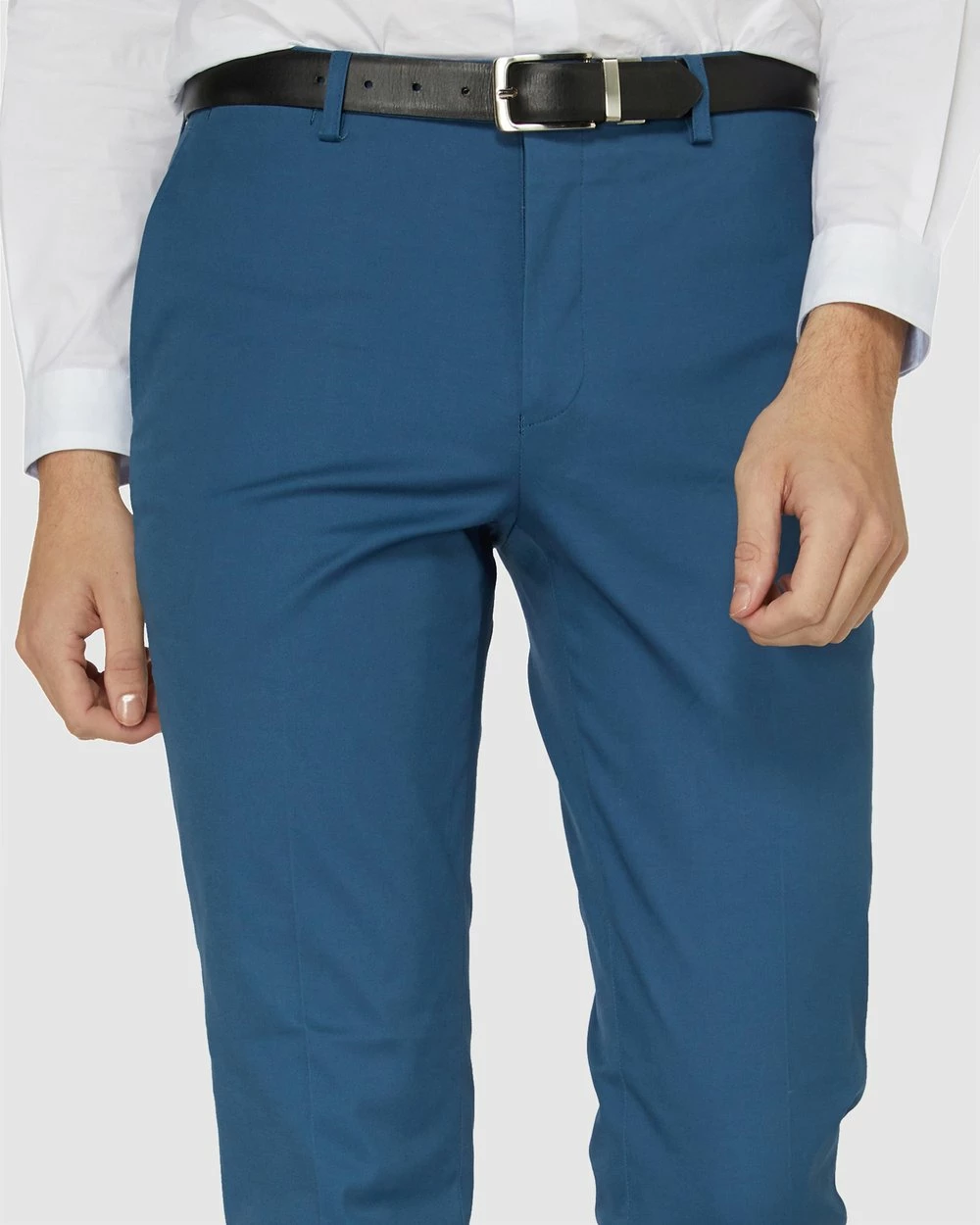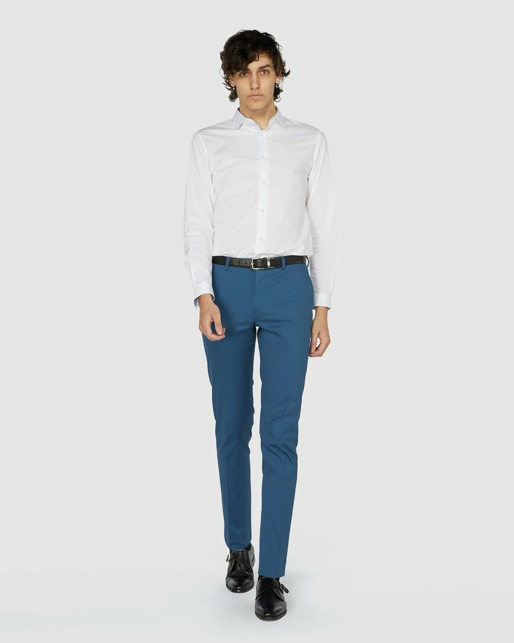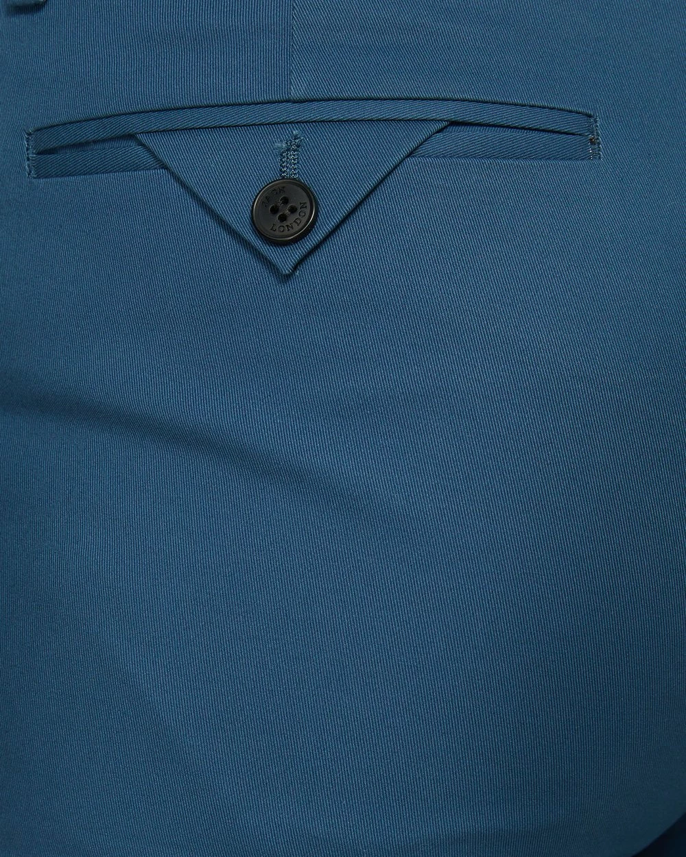 The Petrol Dress Chinos by Jack London are petrol coloured chinos. This pair of pants has a zip fly with button fastening, rear jet pockets, cuffed hems, angled front pockets and are expertly finished with soft tonal lining.