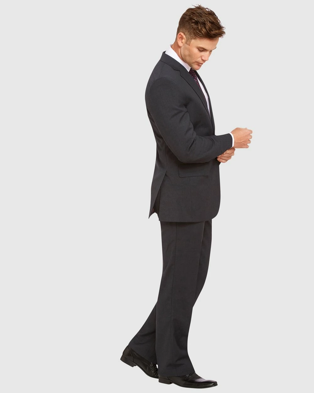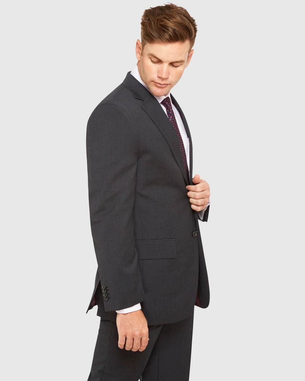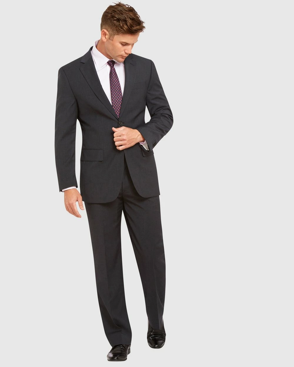 The Kelly Country Kings Road Semi Fit Suit. This classic charcoal grey light weight suit is suited to the modern man. A perfect choice for an ‘all year rounder’ and this Wool Blend suit is a must-have for all seasons. Fresh and light, a smart and polished look for a multitude of occasions, be it the boardroom or pre-dinner drinks after hours.