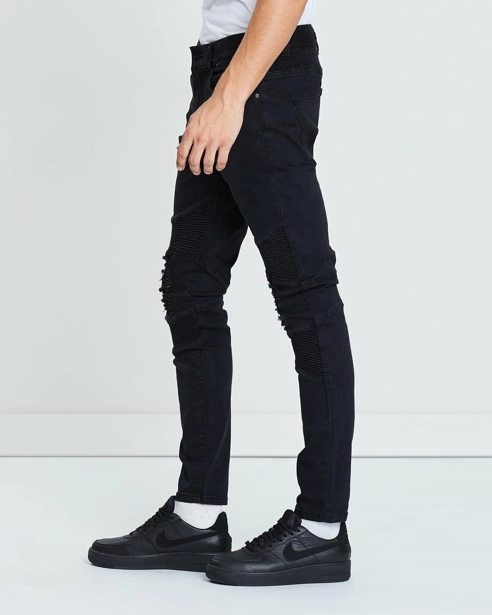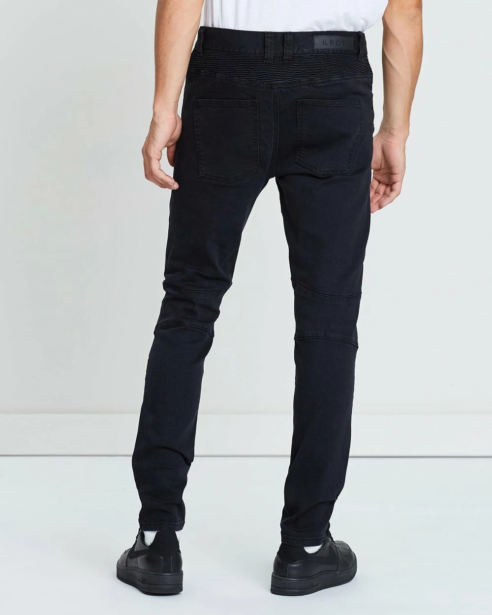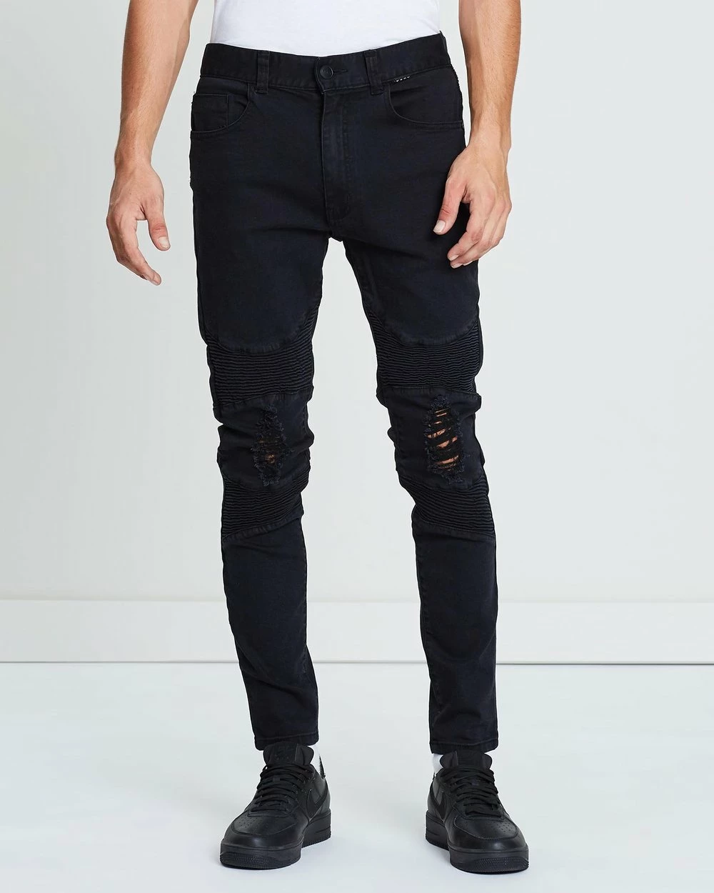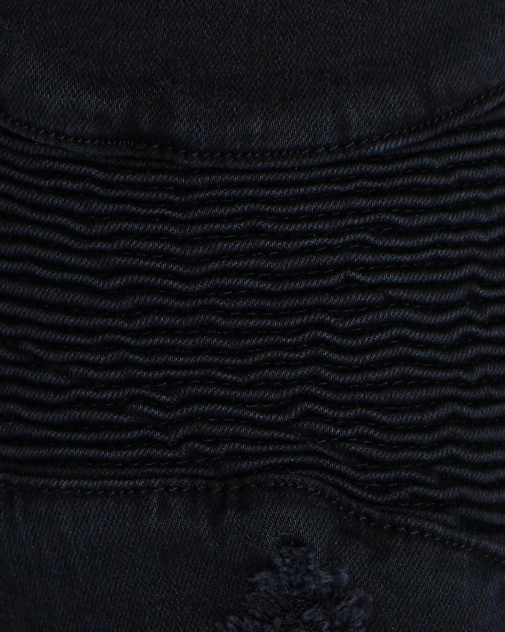 – Pintuck, moto-inspired detailing through thighs, knees and reverse waist; distressed detailing