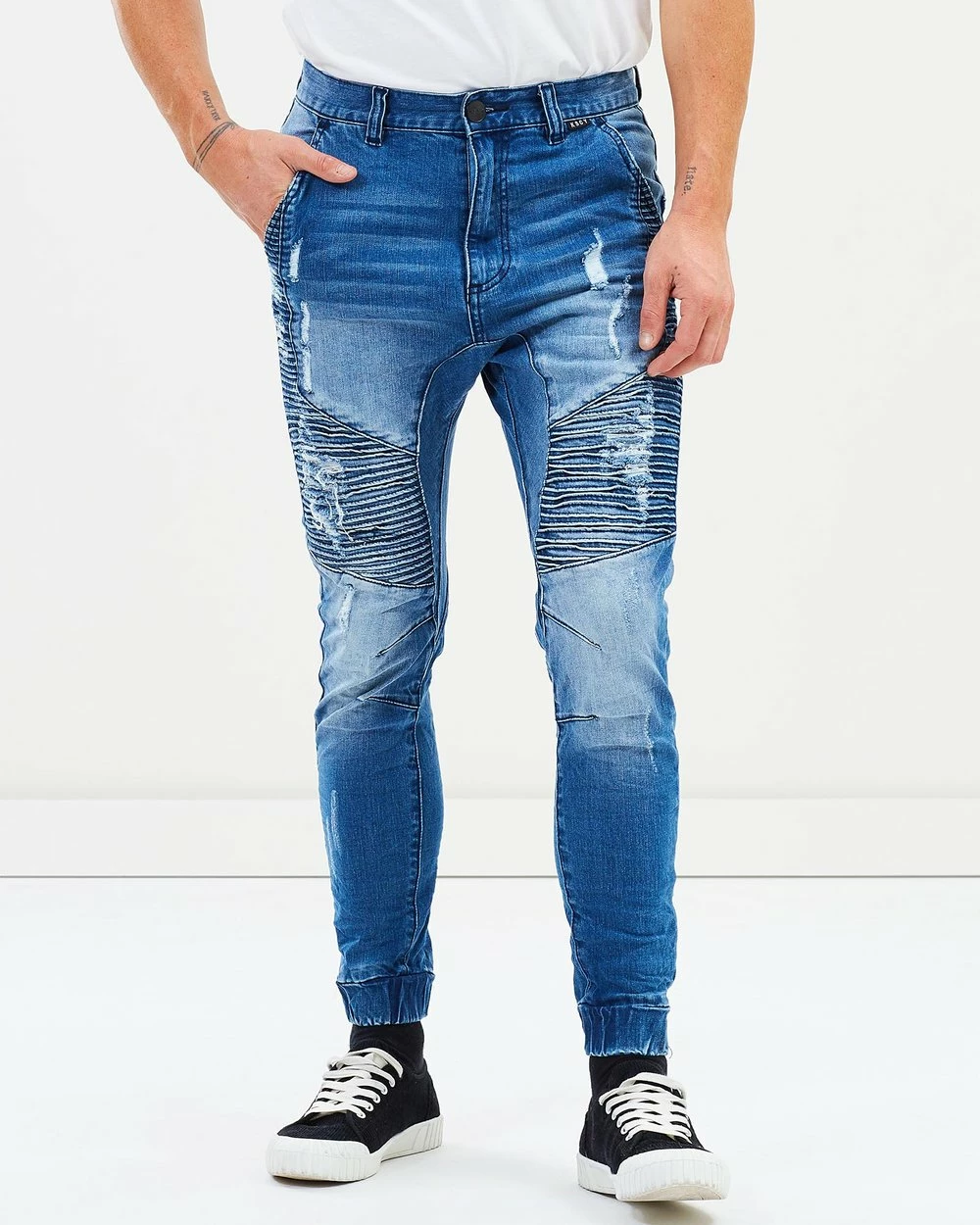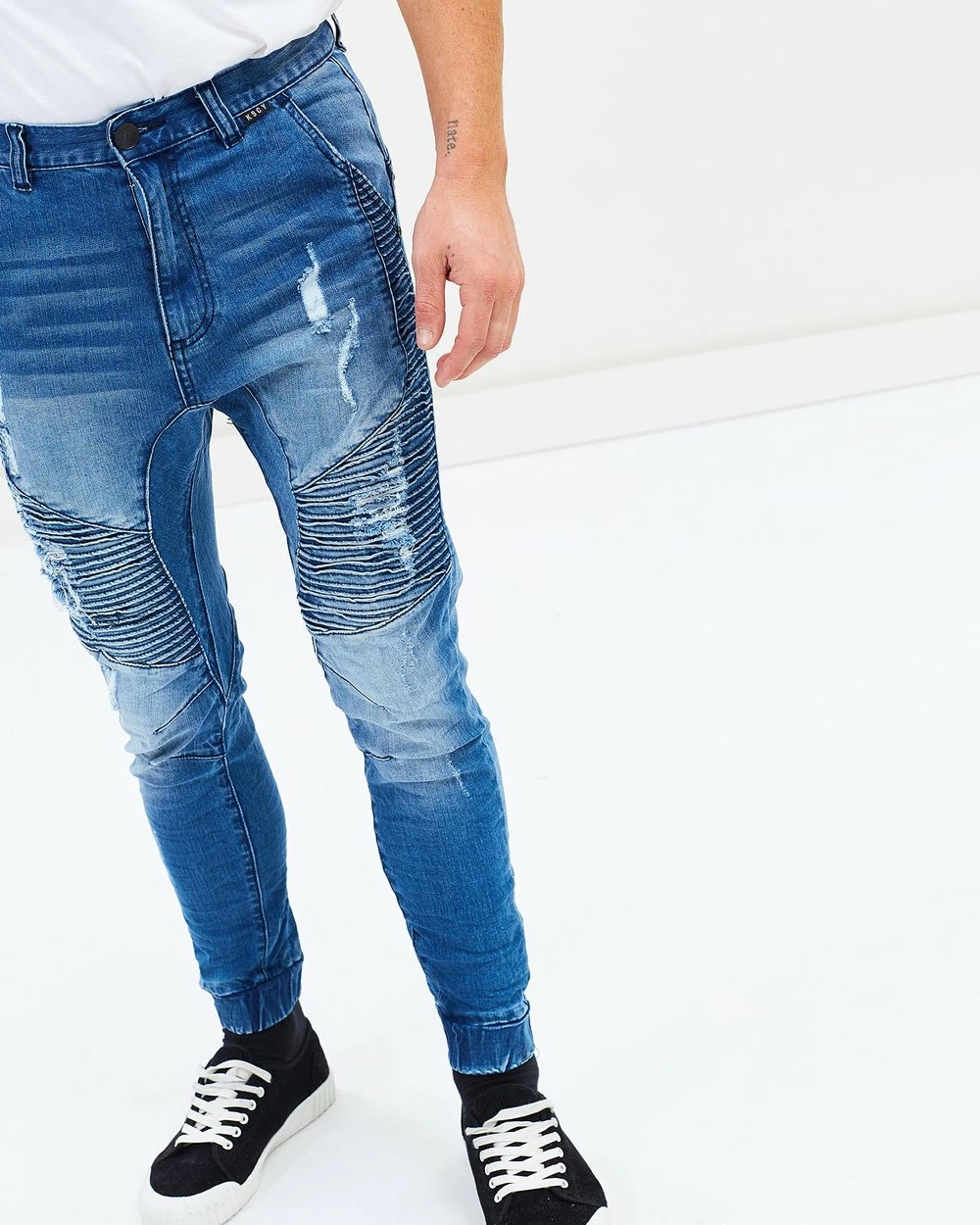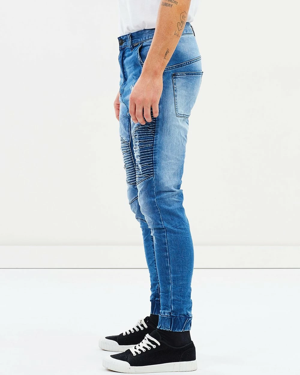 – Pintuck, moto-inspired detailing through thigs and knees; distressed detailing