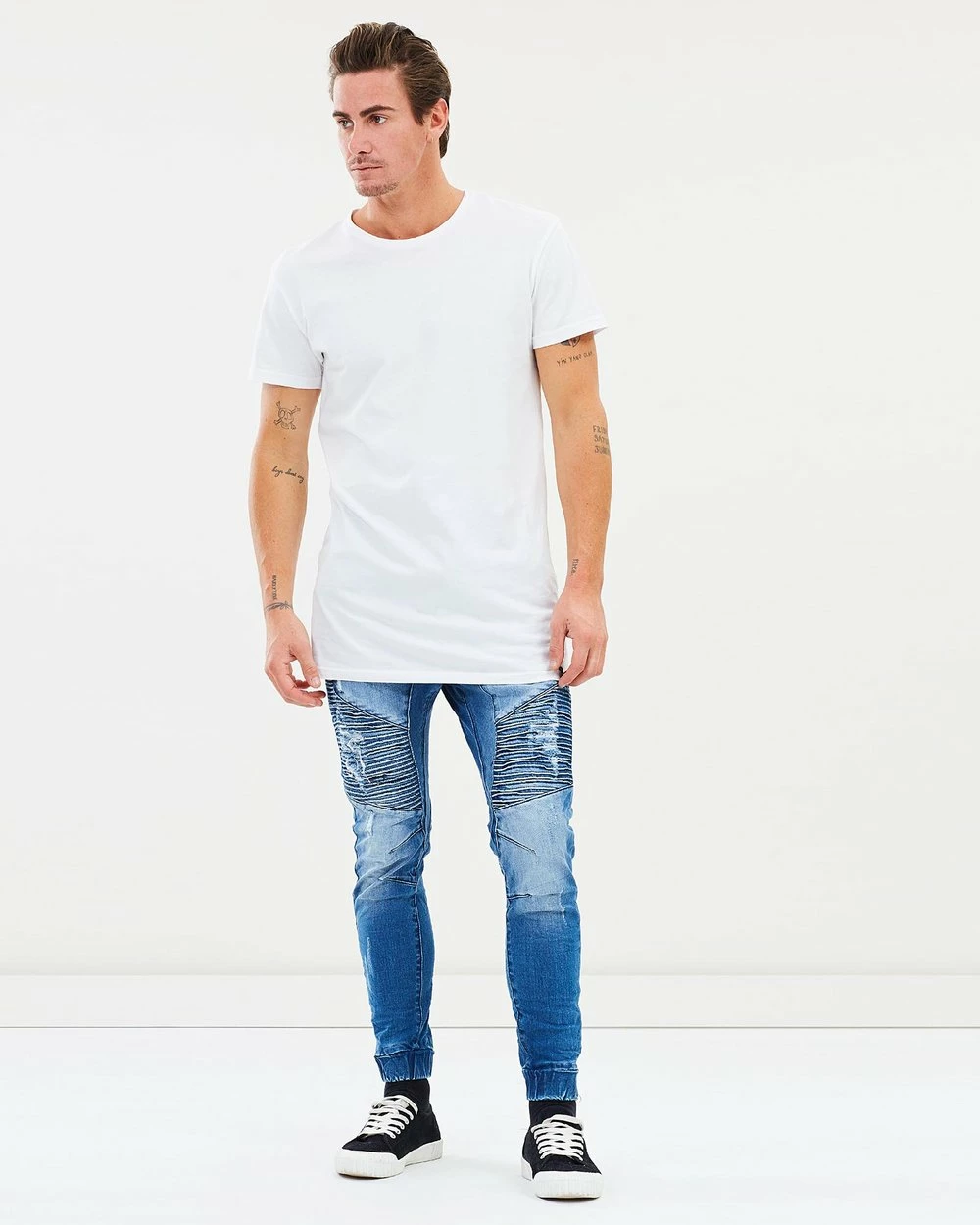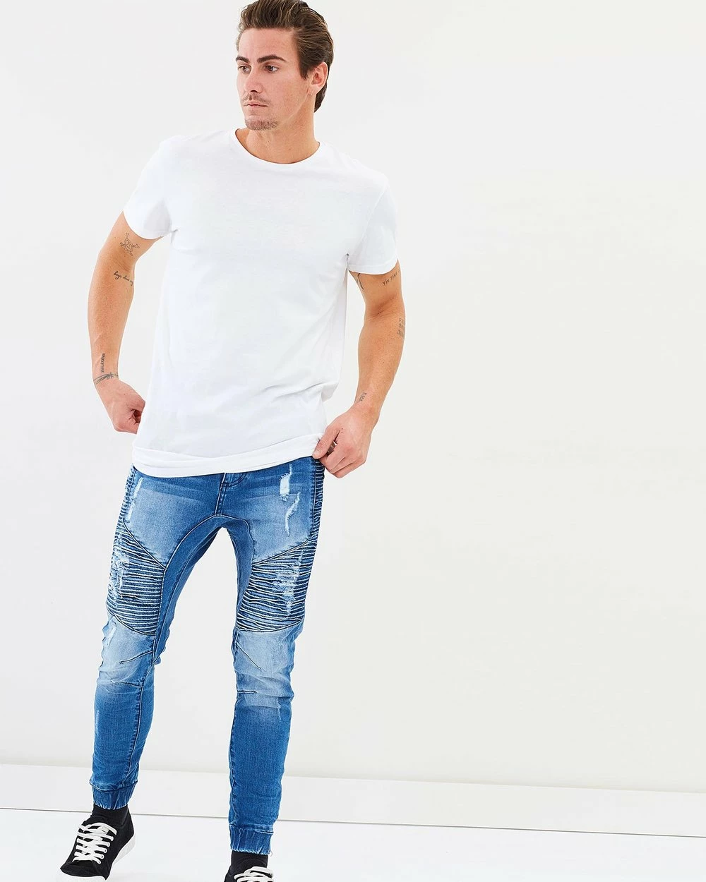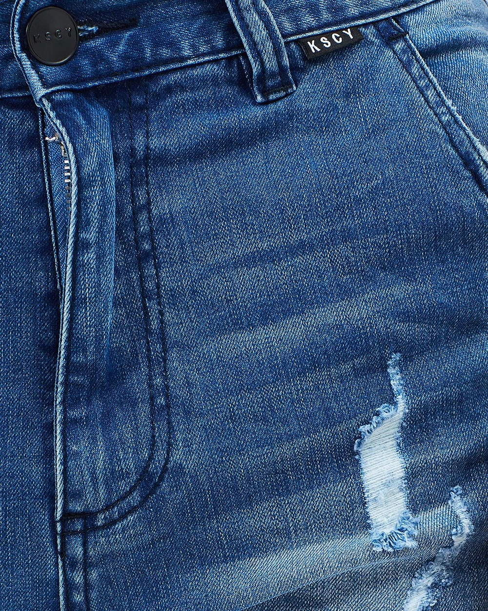 – Pintuck, moto-inspired detailing through thigs and knees; distressed detailing