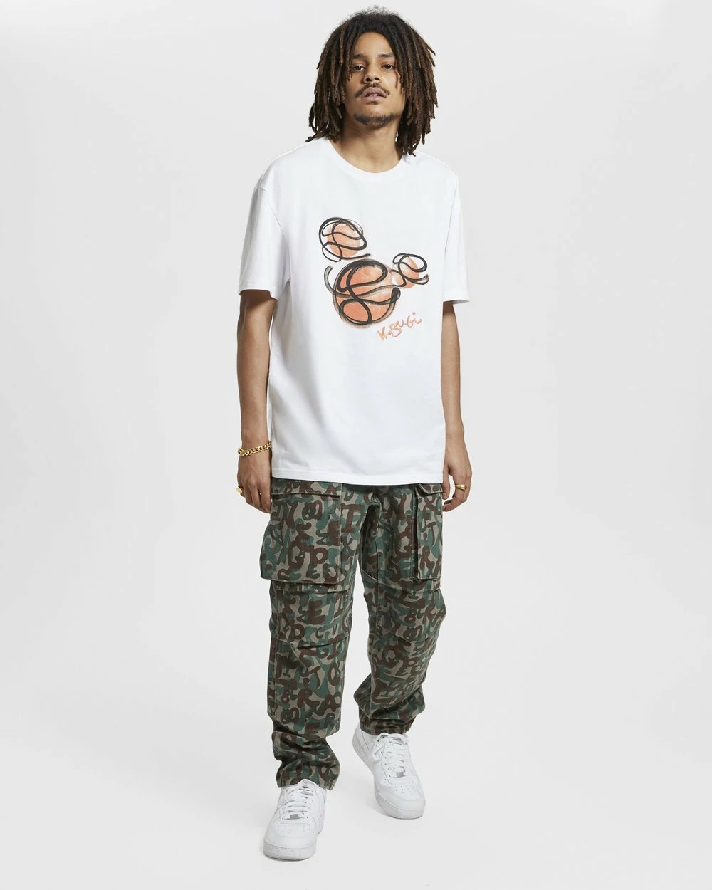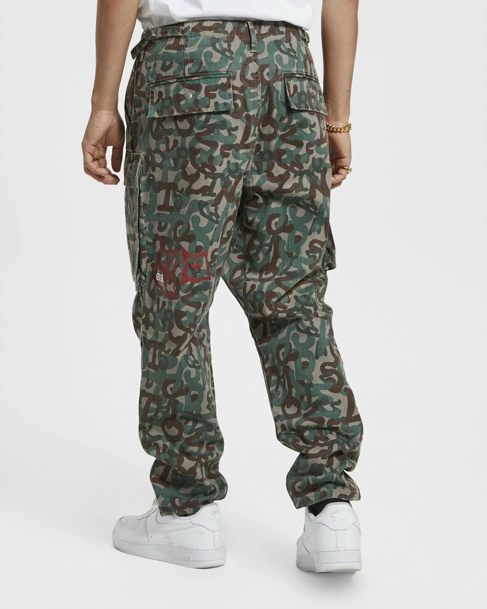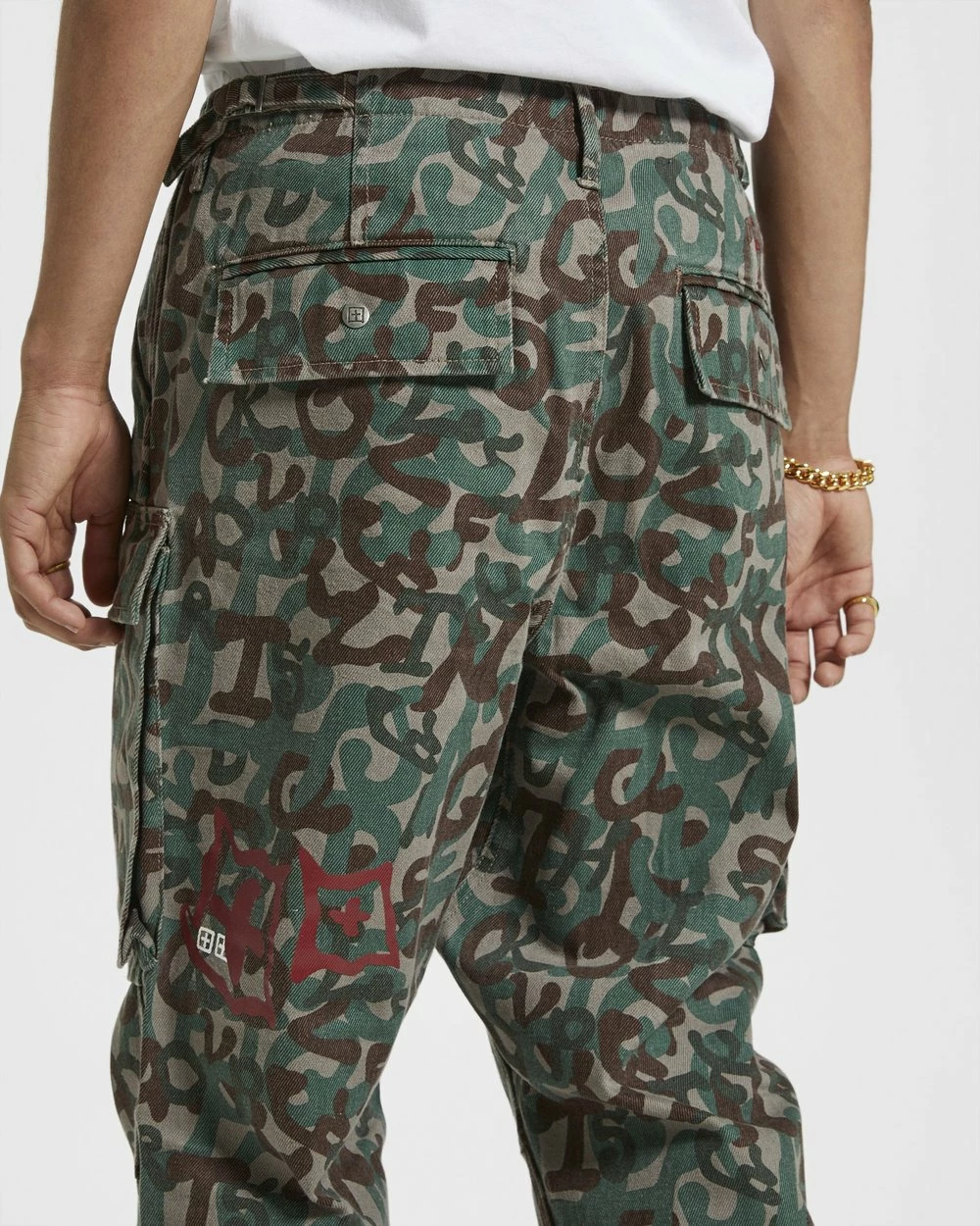 The Frequency Cargo Pant Camo by Ksubi is blocked in a cotton drill with alphabet camo print all over. This pair is styled with a blown up t-box lock up smash printed onto the back leg for that cool look.