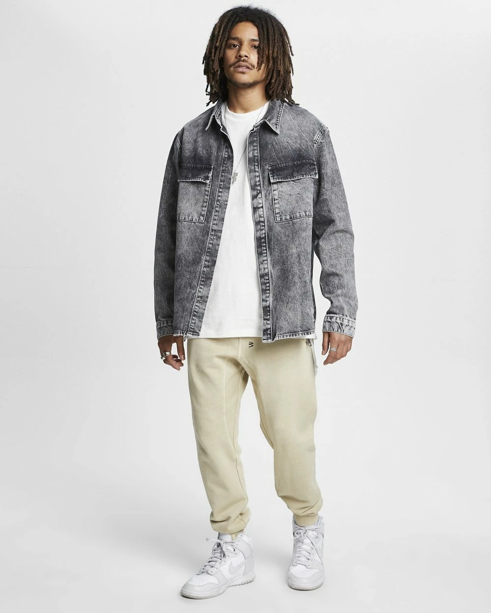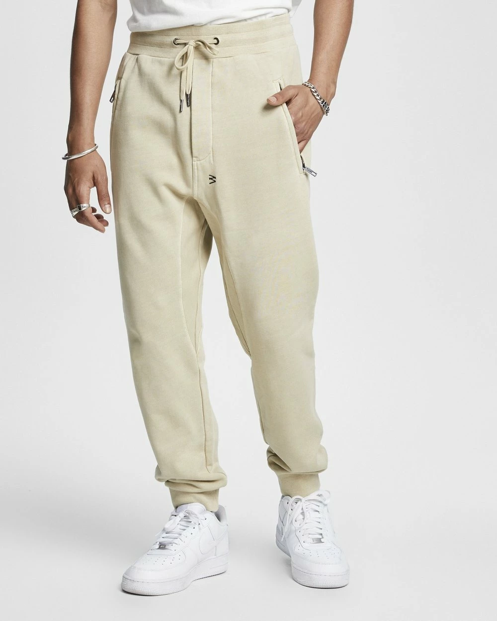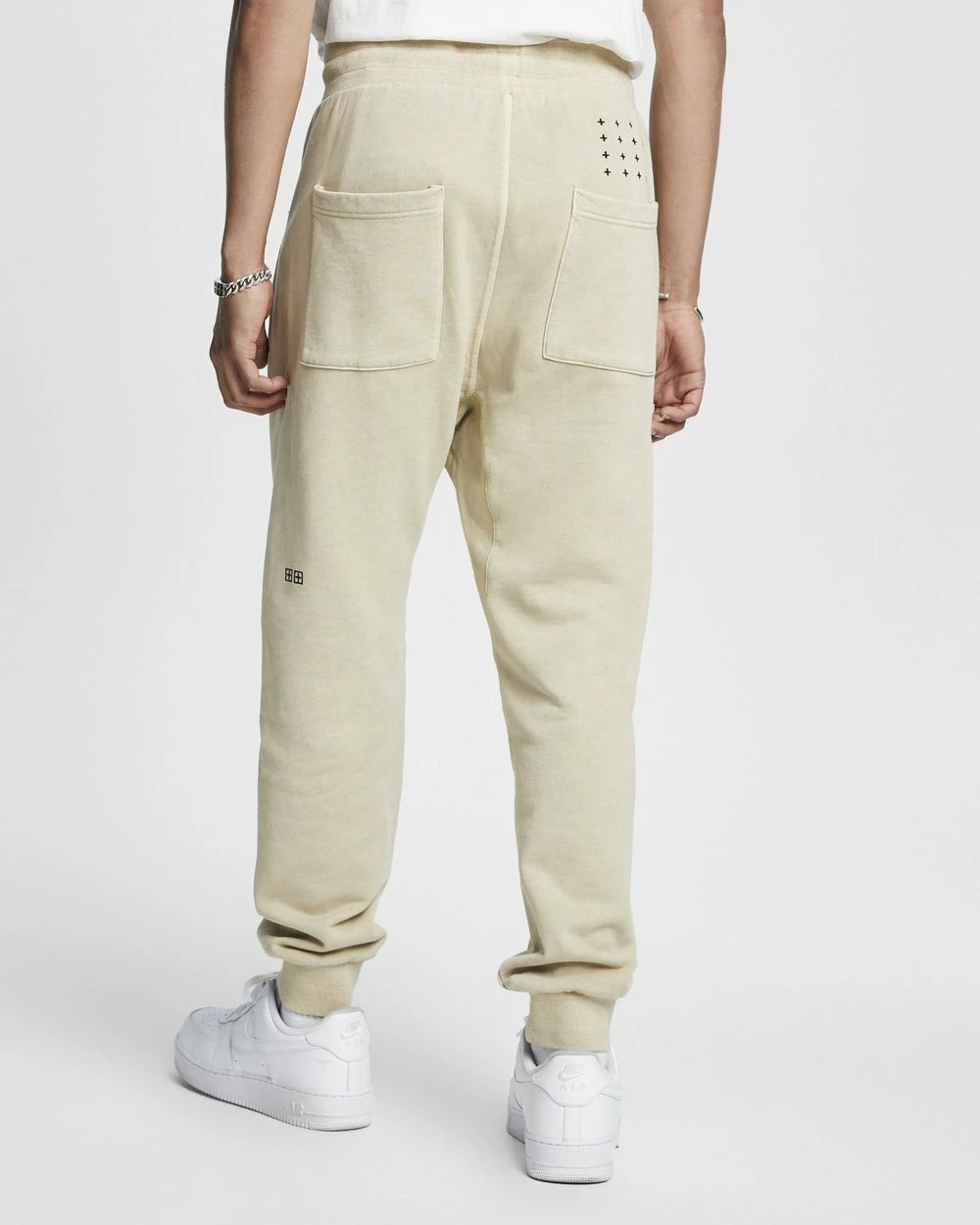 The Restore Trax Palm by Ksubi is a pair of mid rise, relaxed fit track pants with tapered legs. This style features Ksubi branding and is made from a premium loopback cotton fleece in an overdyed colour and aged wash. It has rib hem cuffs, drawstring through elasticated rib waistband, slanted welt pockets with zipper closure at the front and patch pockets at the back.