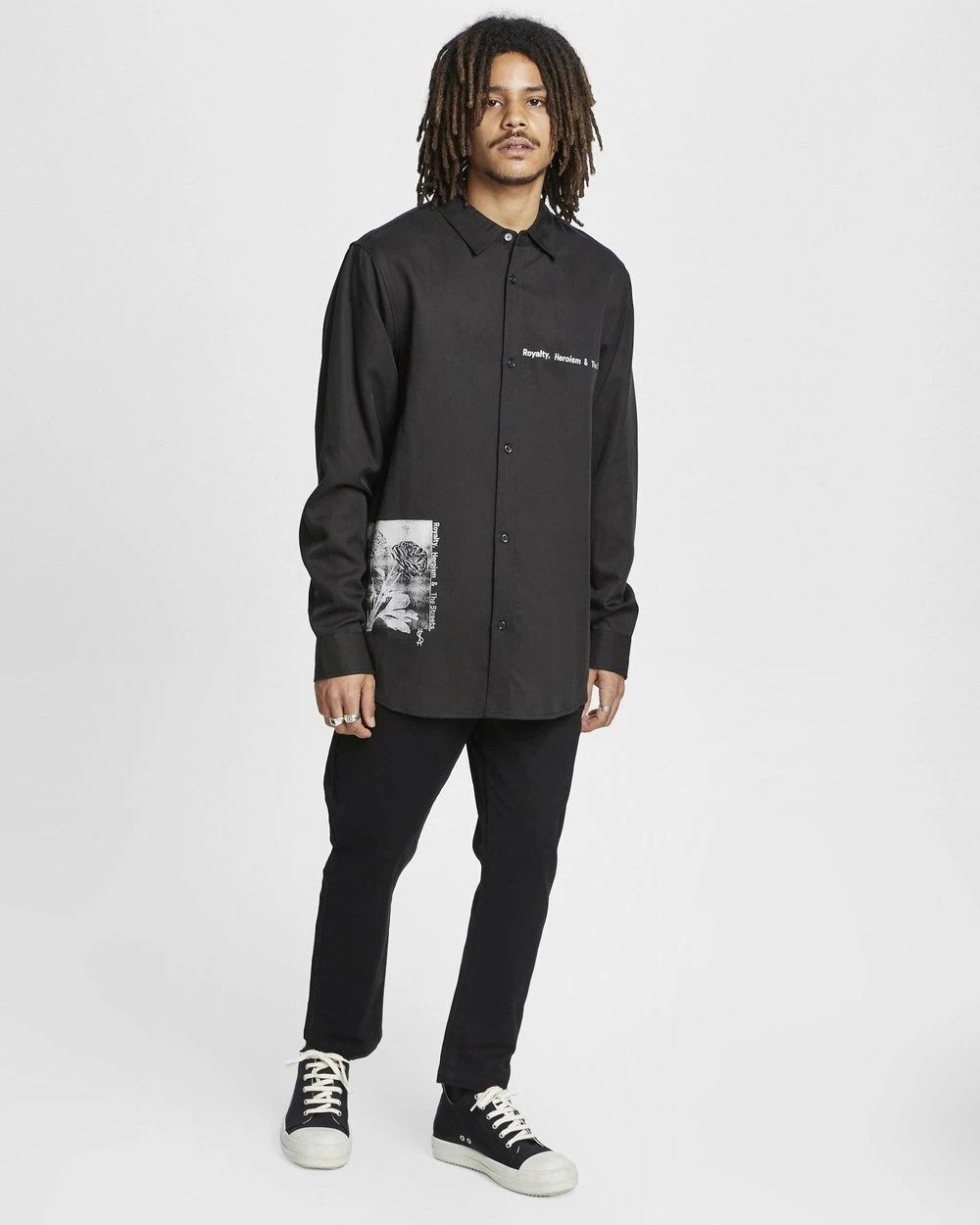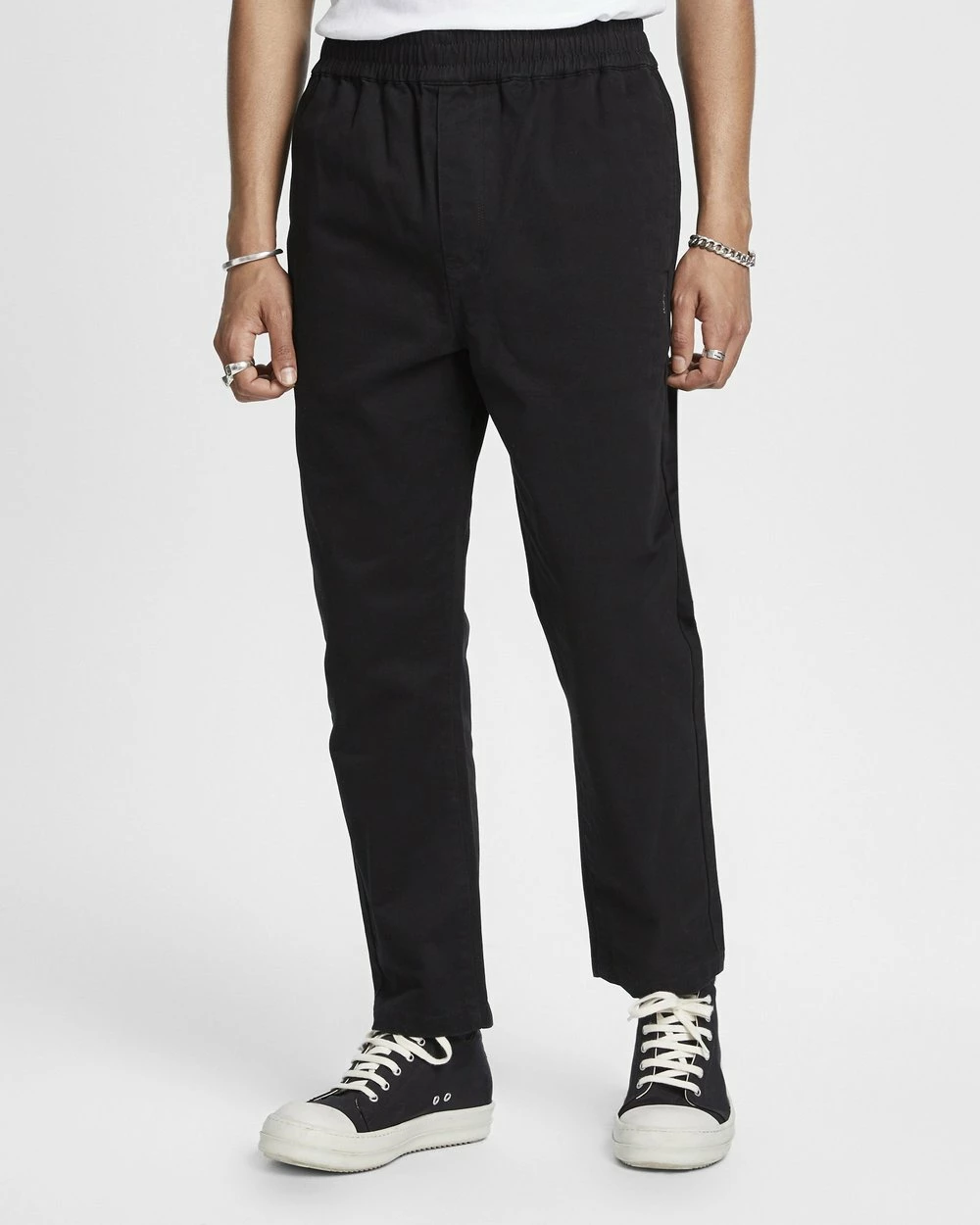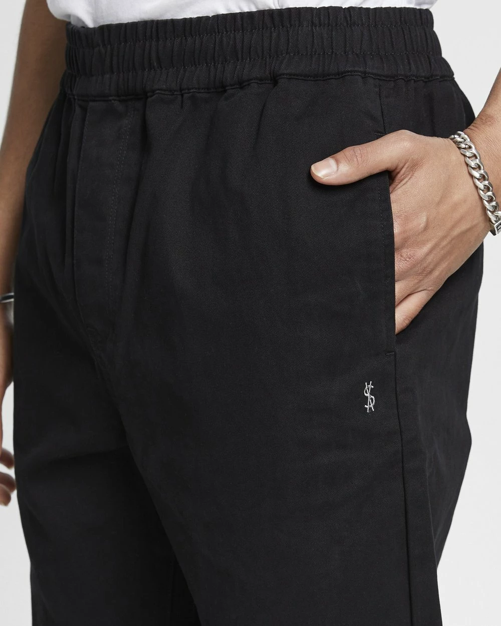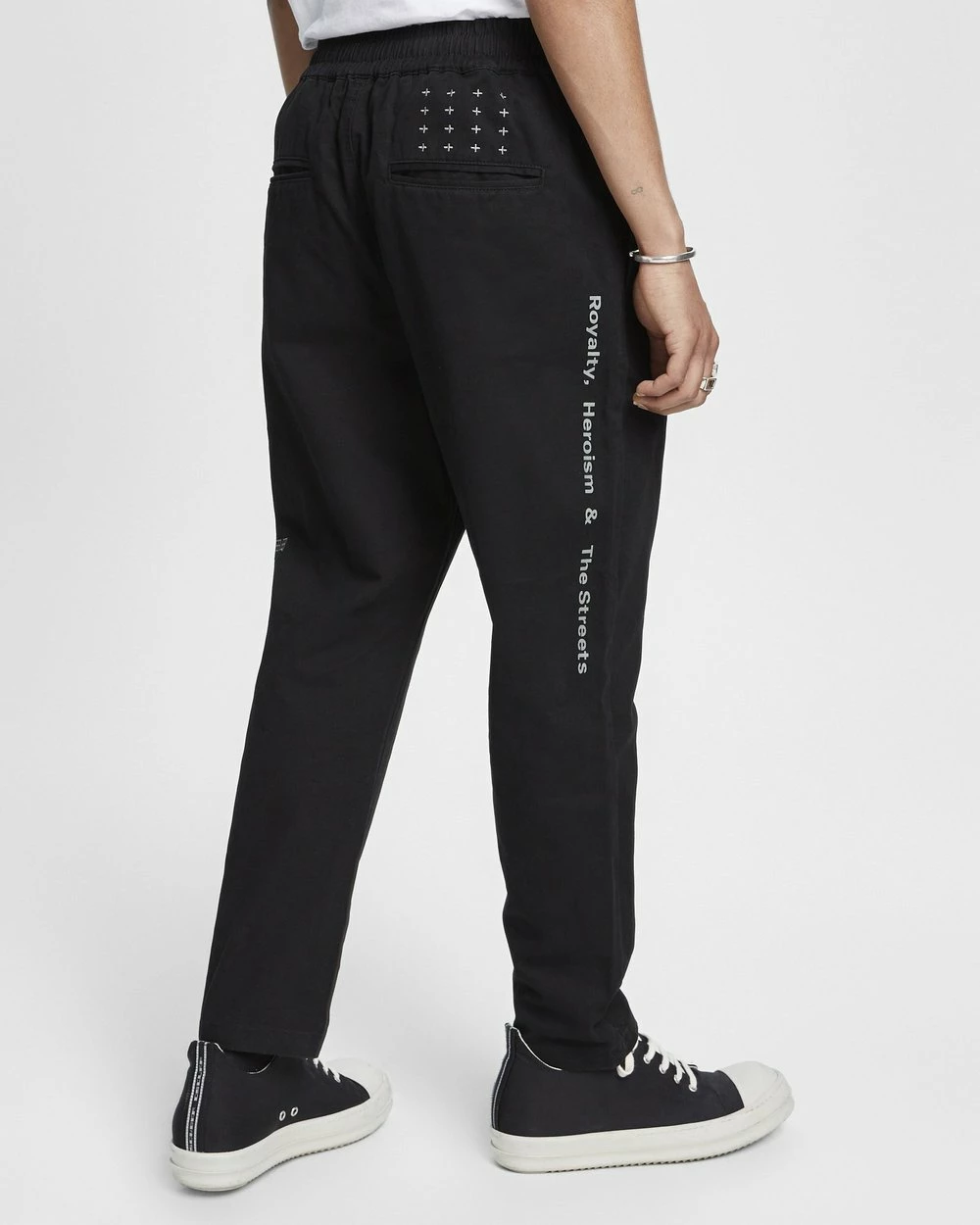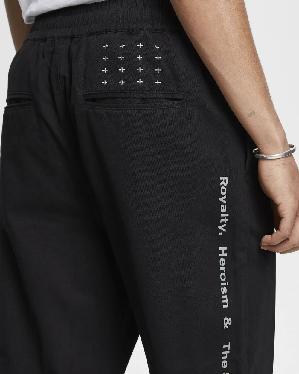 The Rose Royalty Voltage Pant by Ksubi is a mid rise pants with slight tapered leg. These black pants for men features an elasticated waistband, side pockets and back welt pockets. It is made from premium cotton blend drill for a relaxed fit. For the signature Ksubi look, it features smash print, front fly stitching detail and Ksubi branding.