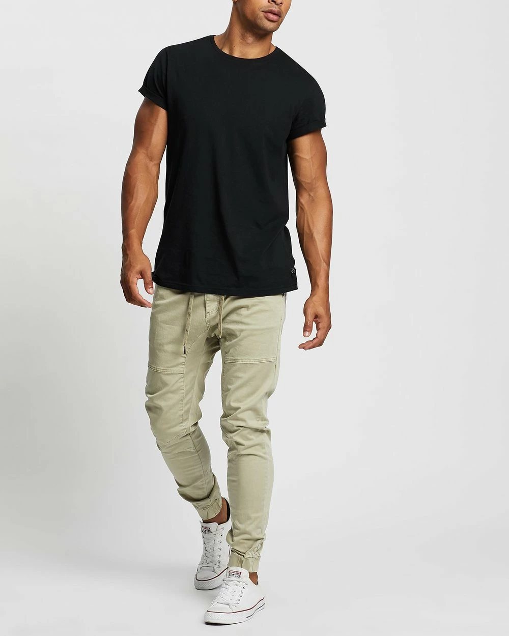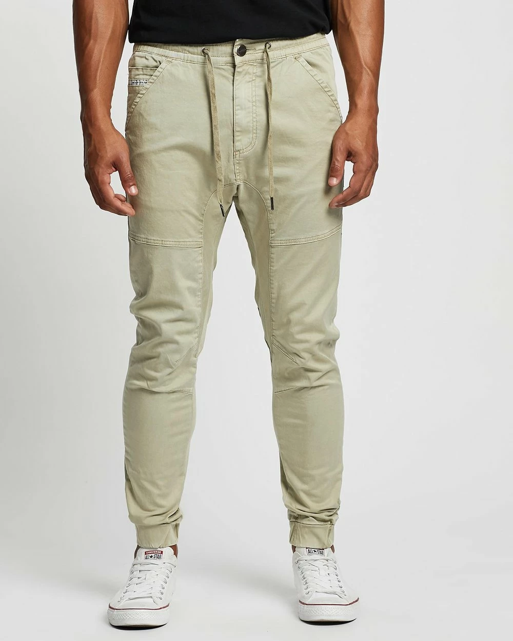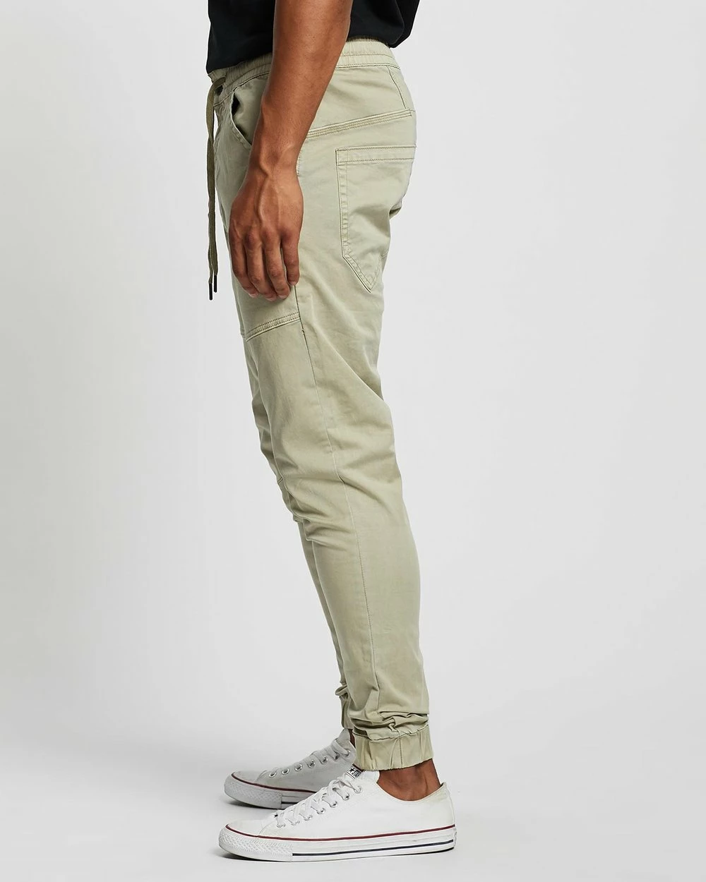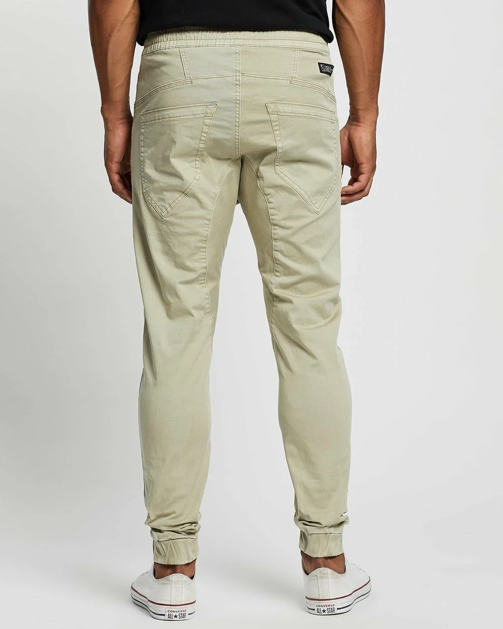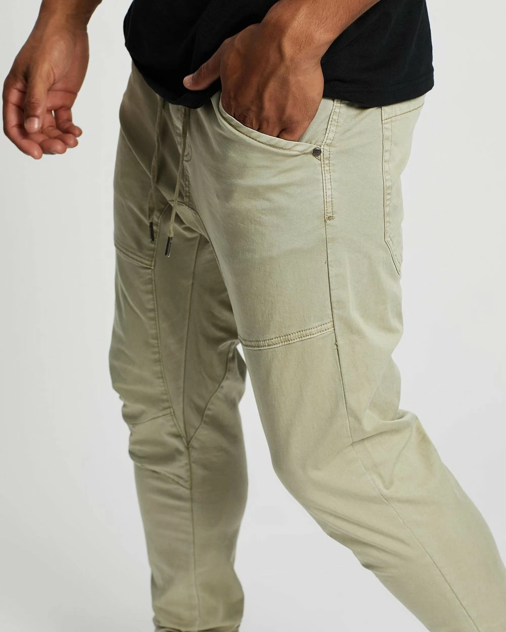 – Cotton-rich fabrication with slight added stretch- 5 pocket design with button-through-fly fastening- Elasticised ankle cuffs for tapered jogger cut