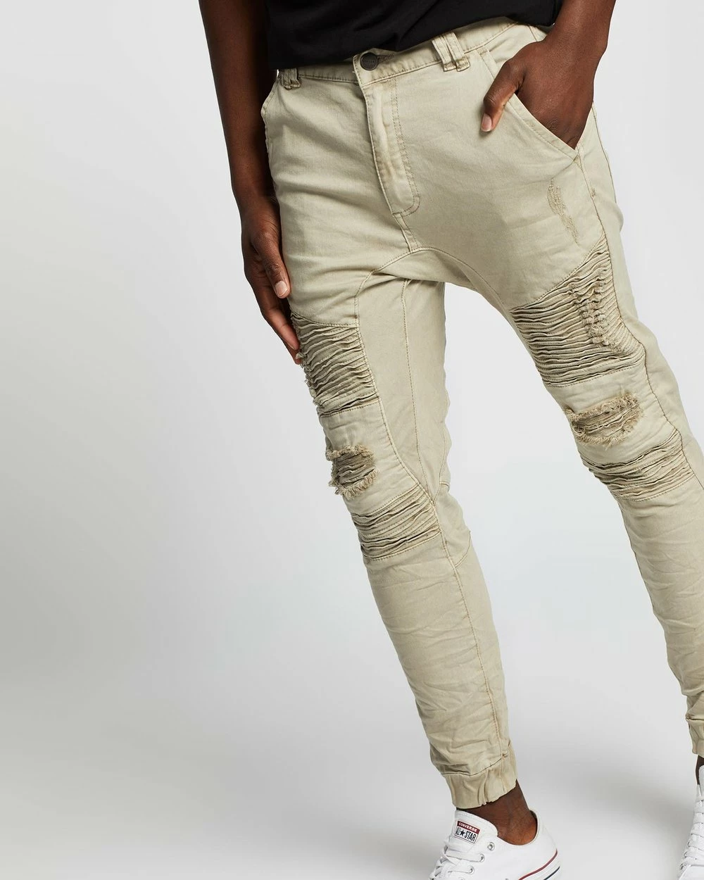 – Pin-tuck and ripped detailing to thighs