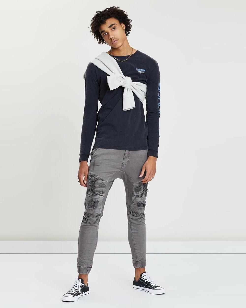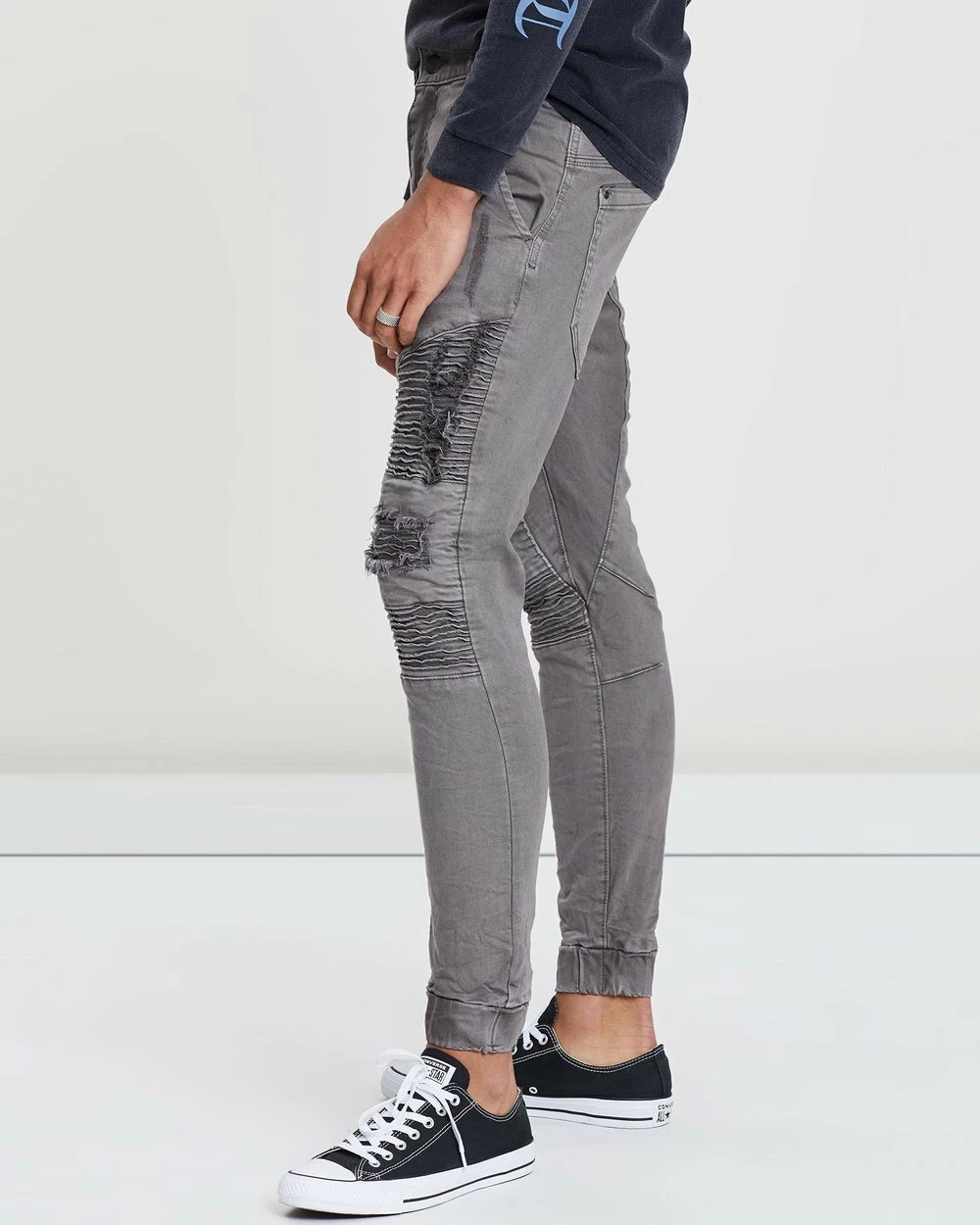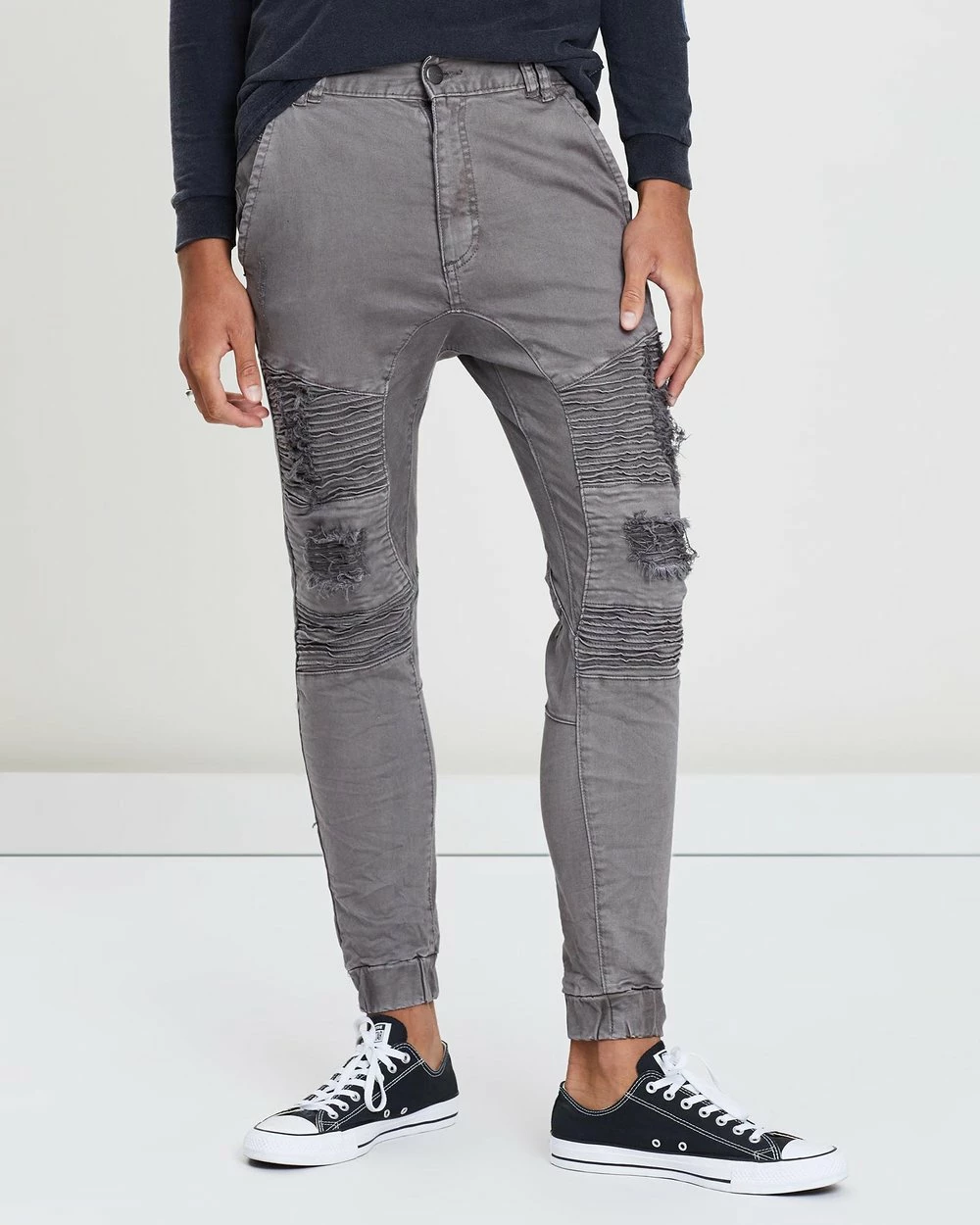The Nena & Pasadena Hellcat Pants are crafted in a versatile grey wash, while distressed details and pintucks to the legs provide a moto-style finish.