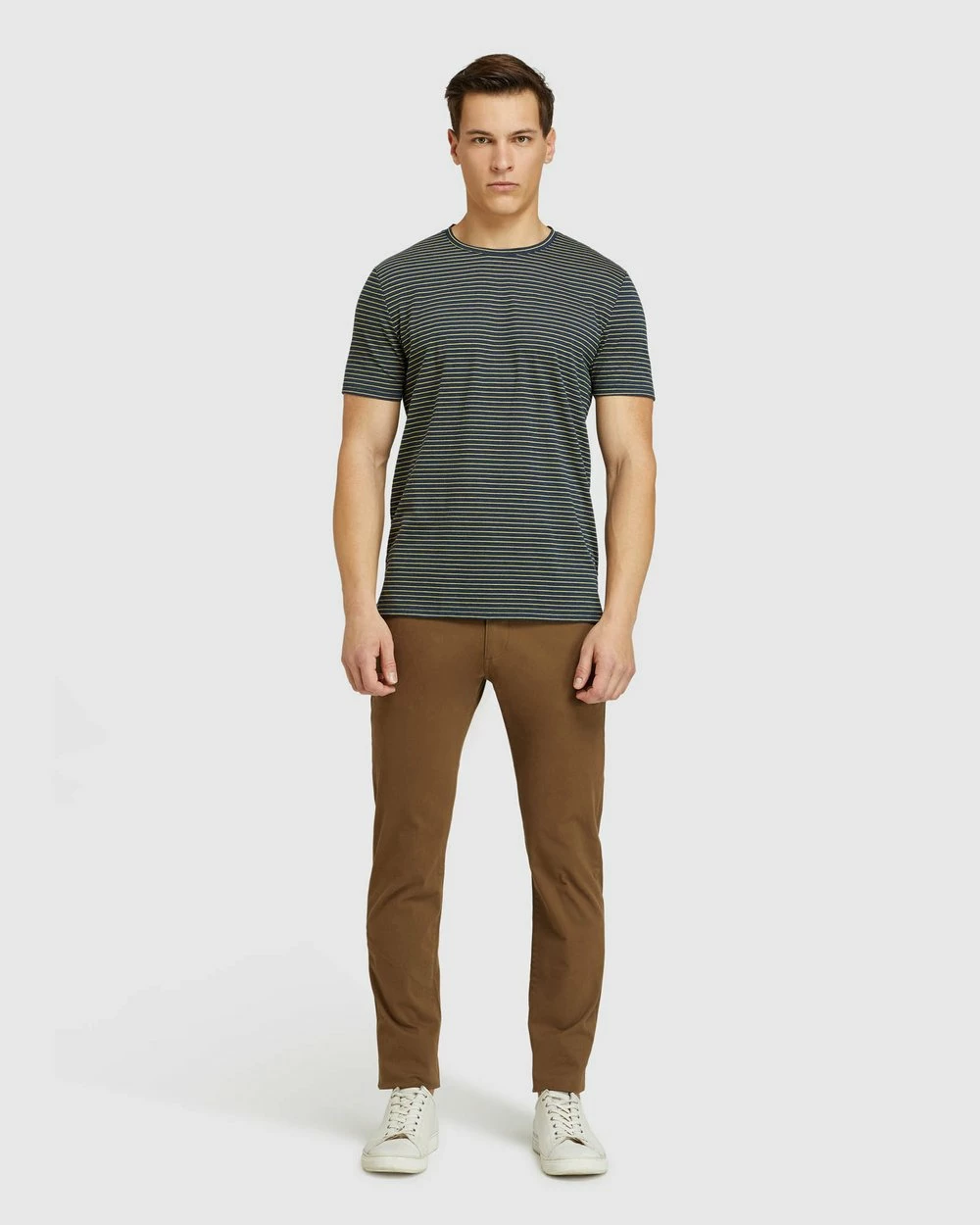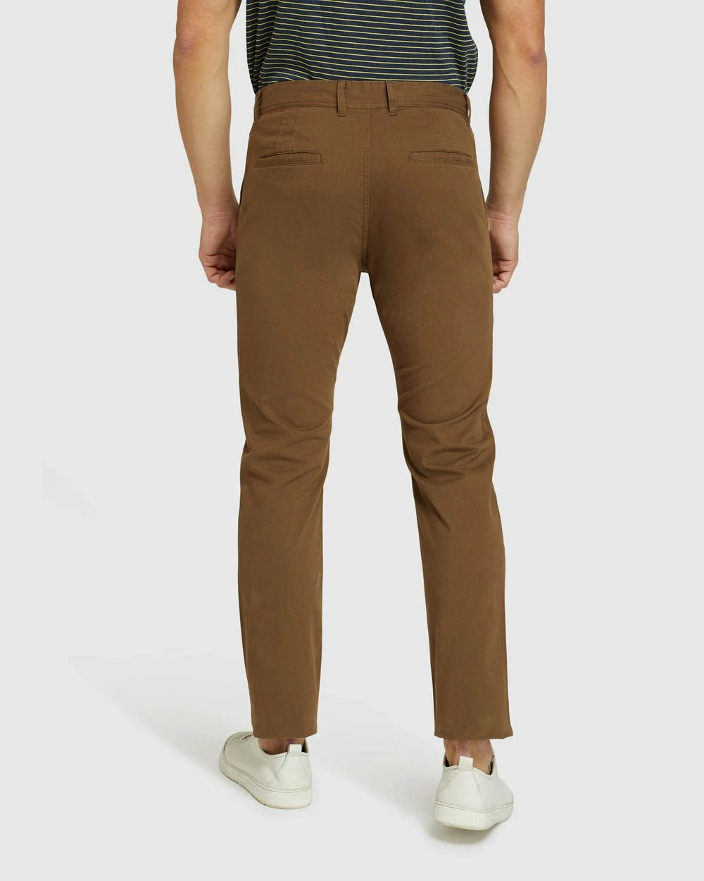 Front rise: 26.75cm, 1/2 leg opening: 17.75cm, Inseam: 83cm (size 84). Our model is wearing a size 84 chinos, and usually takes a size 84. He is 185cm (6’1.75″) tall with a 96.52cm (38″) chest and 81cm (32″) waist.