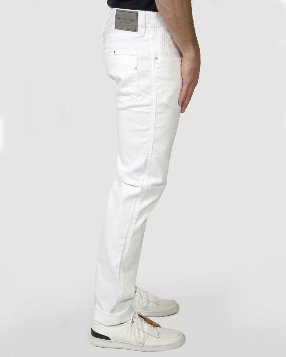 the side, belt loops on the waistband, two welt pockets on the back.