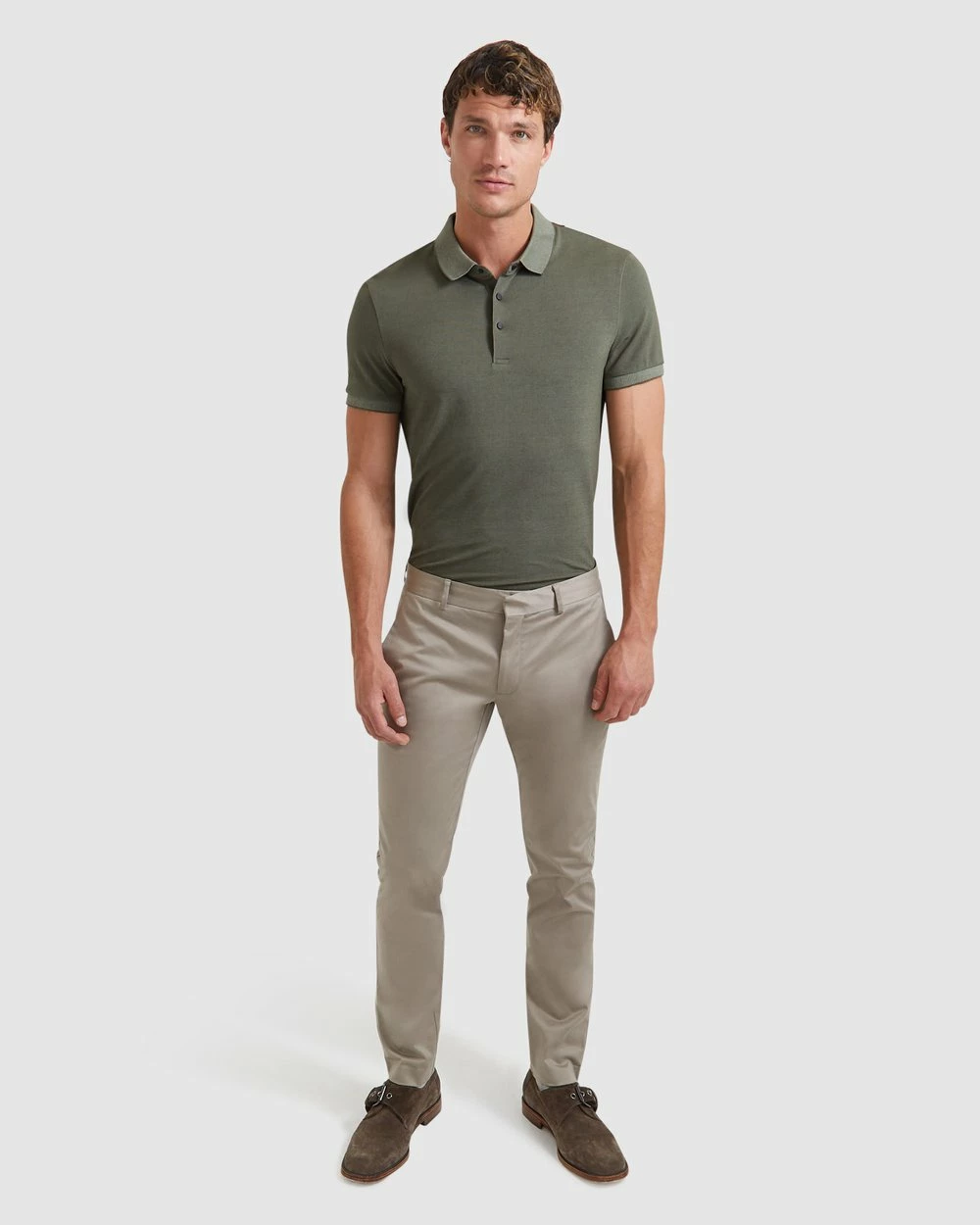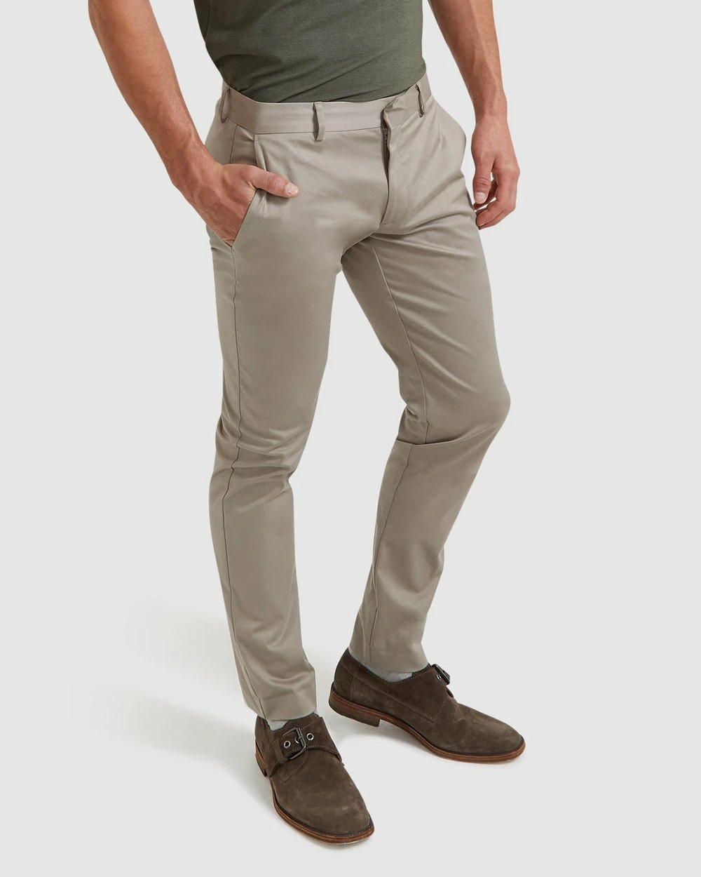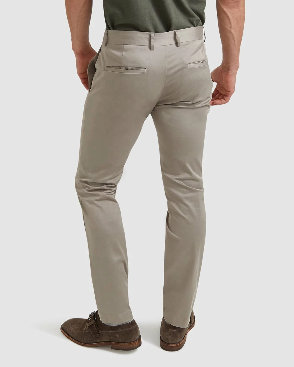 – Length: Inside Leg: 81cm; Front Rise: 24cm; Leg Opening: 36cm (size 32)- Slim fit- Cotton-rich sateen; slight stretch; lined pockets; opaque- Stone- Belt-looped waistband- Zip fly and hook-and-bar fastening- Angled side pockets- Twin buttoned welt pockets to rear