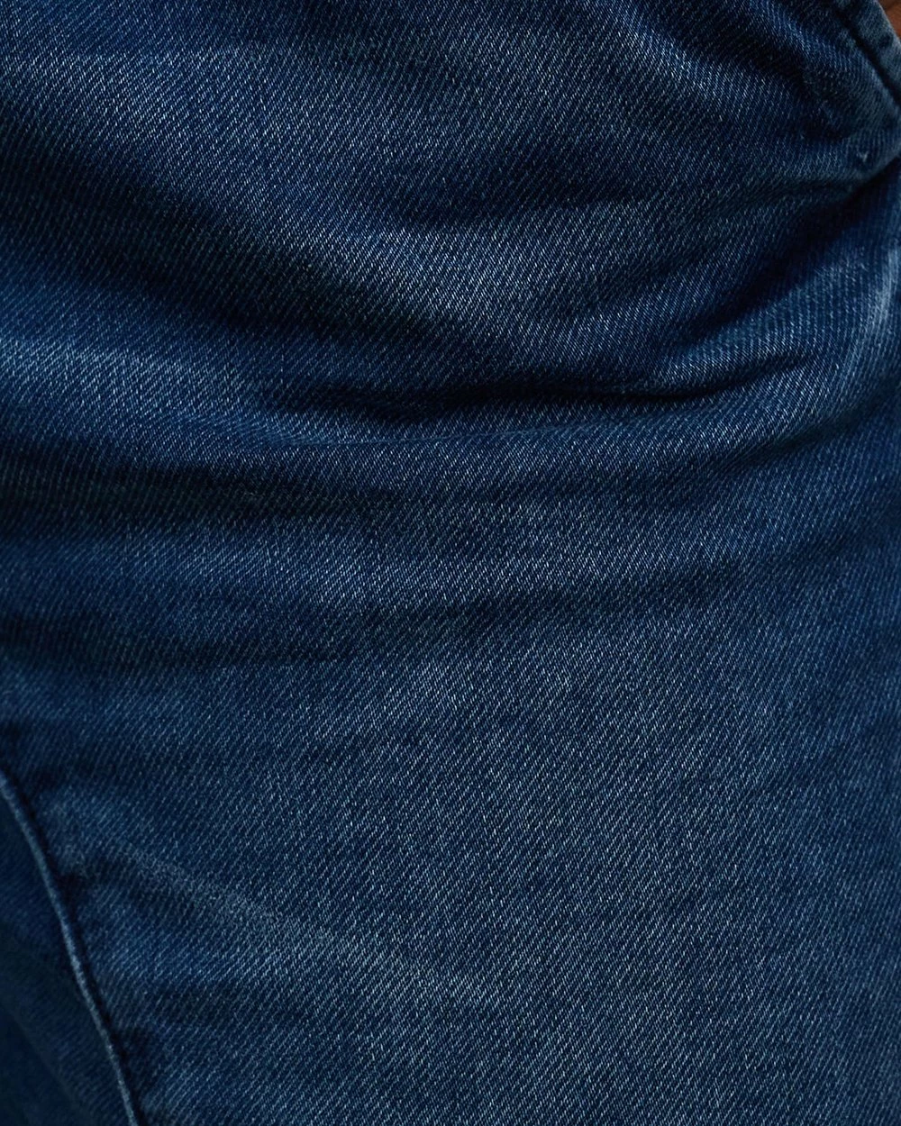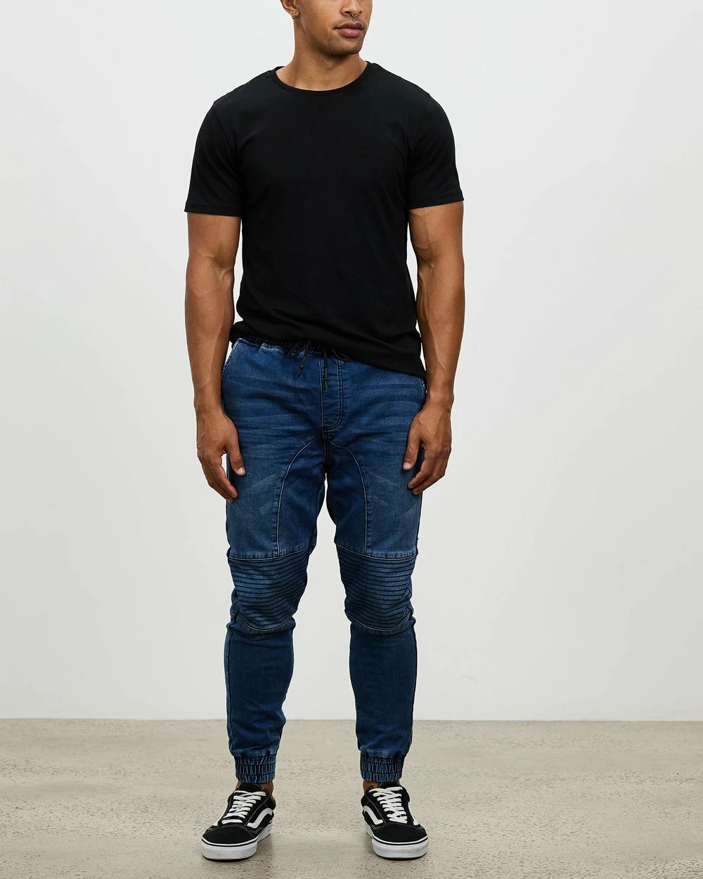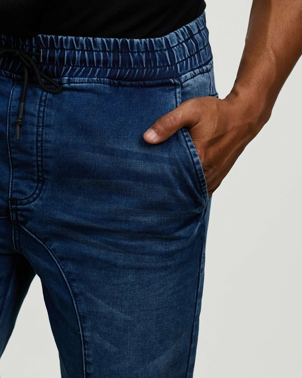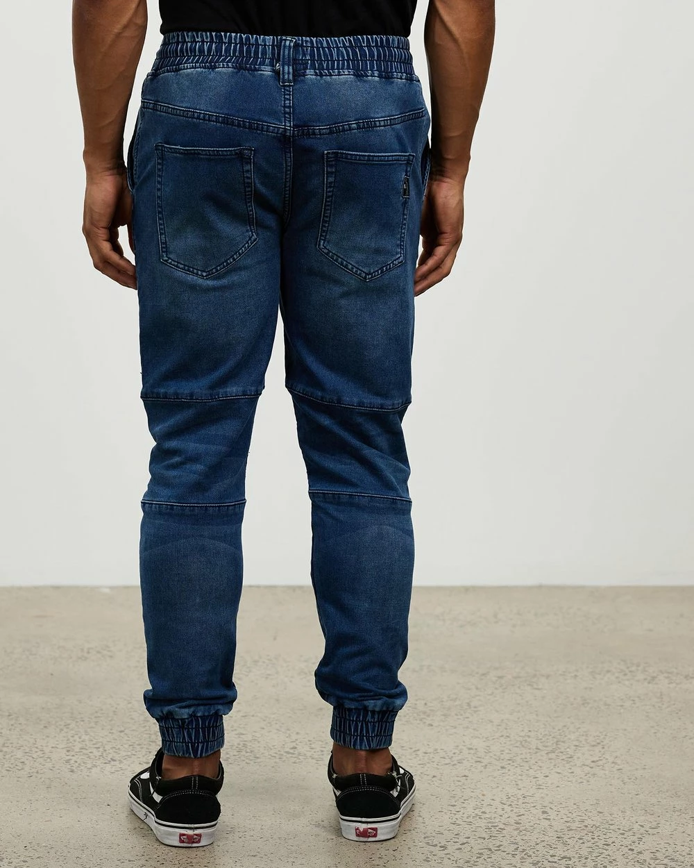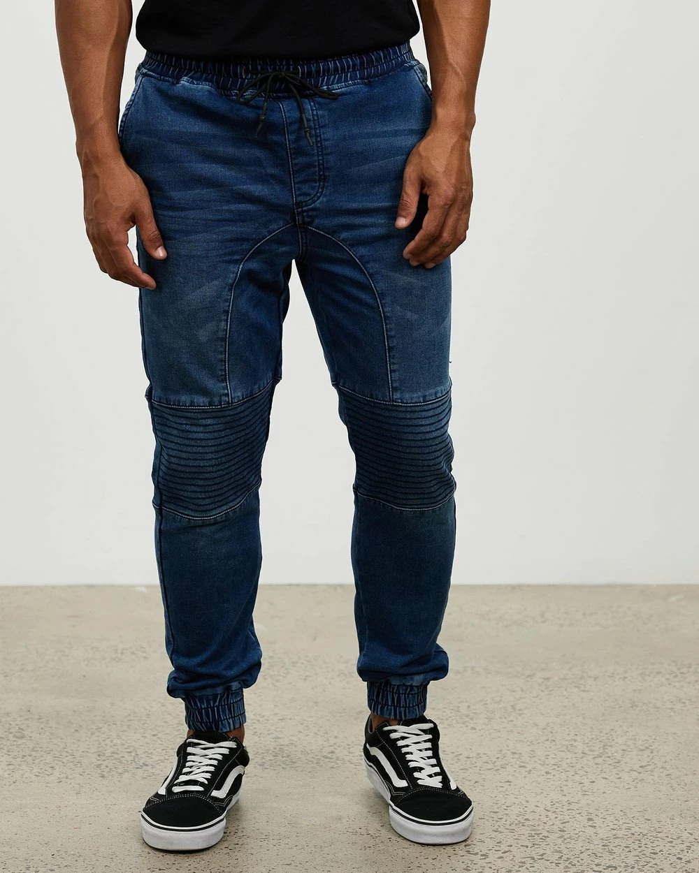 – Adjustable drawstring to elastic waist; wax dipped aglets; drop-crutch; moto patchwork to knees; cuffed ankles