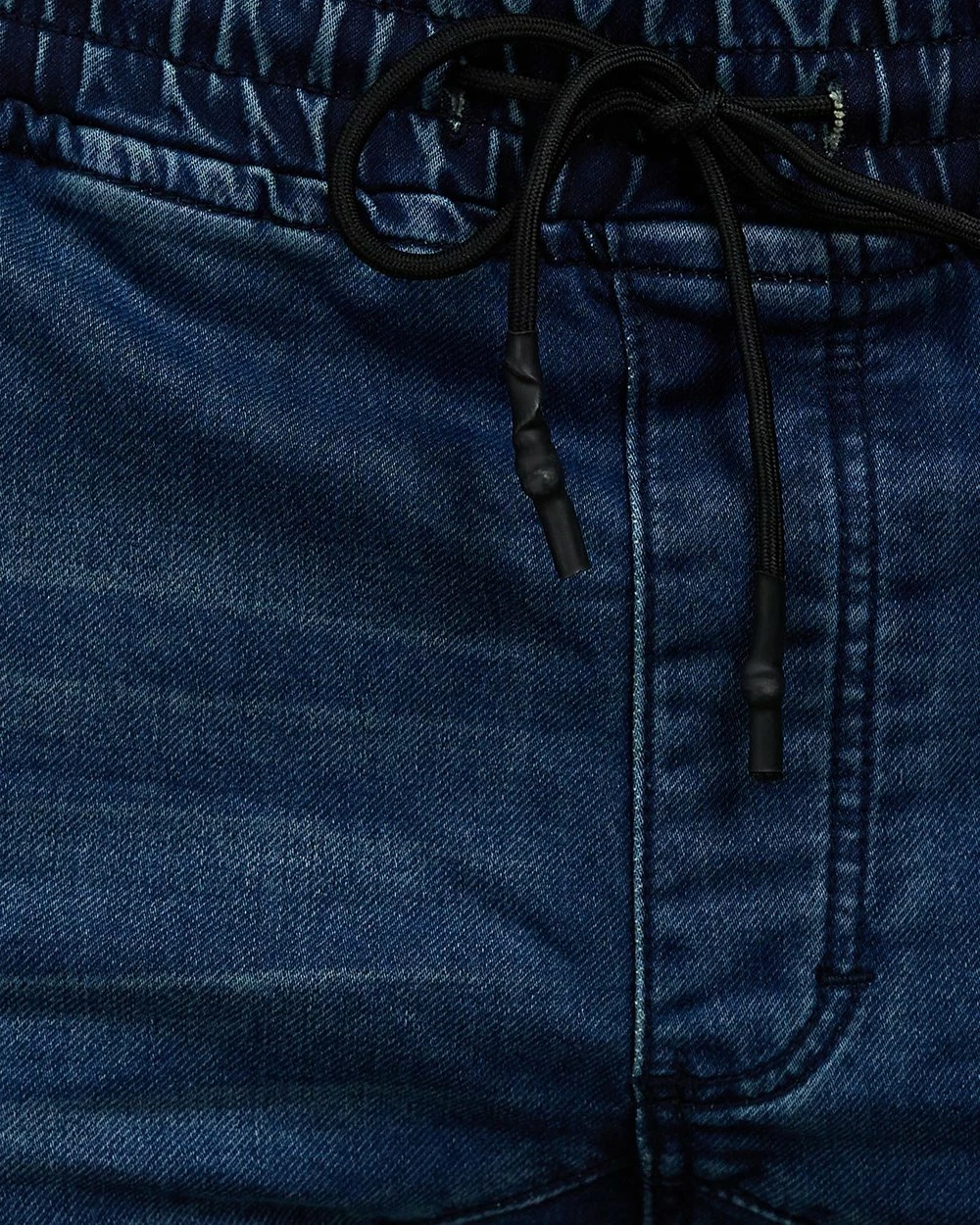 – Elasticised drawstring waistband; faux fly; elasticised cuffs; dropped crotch