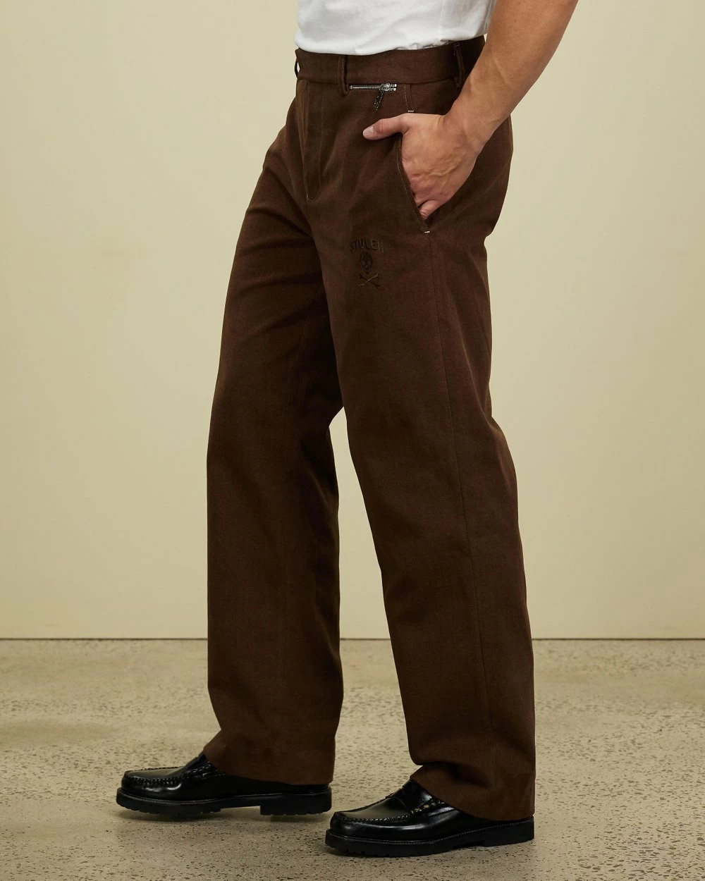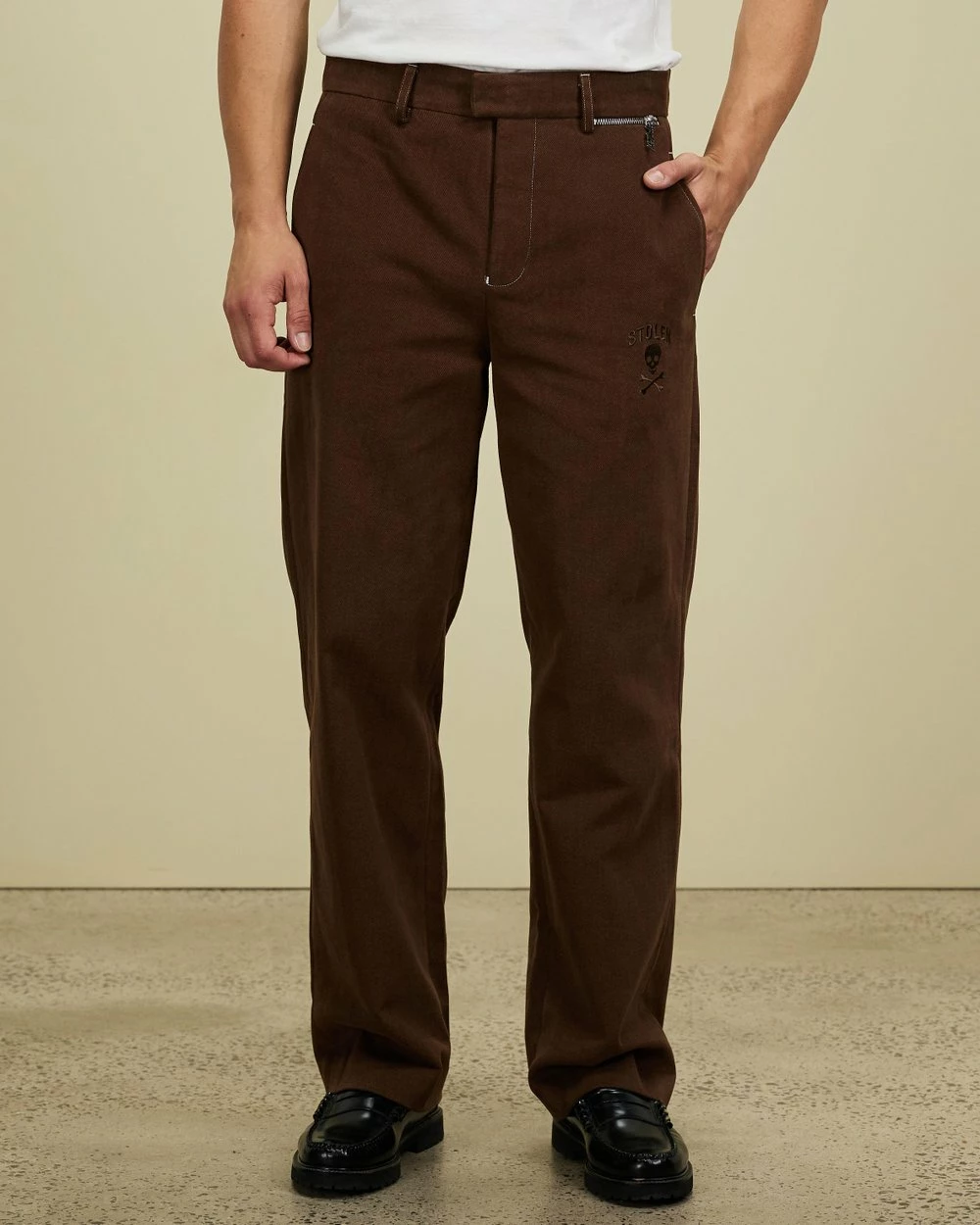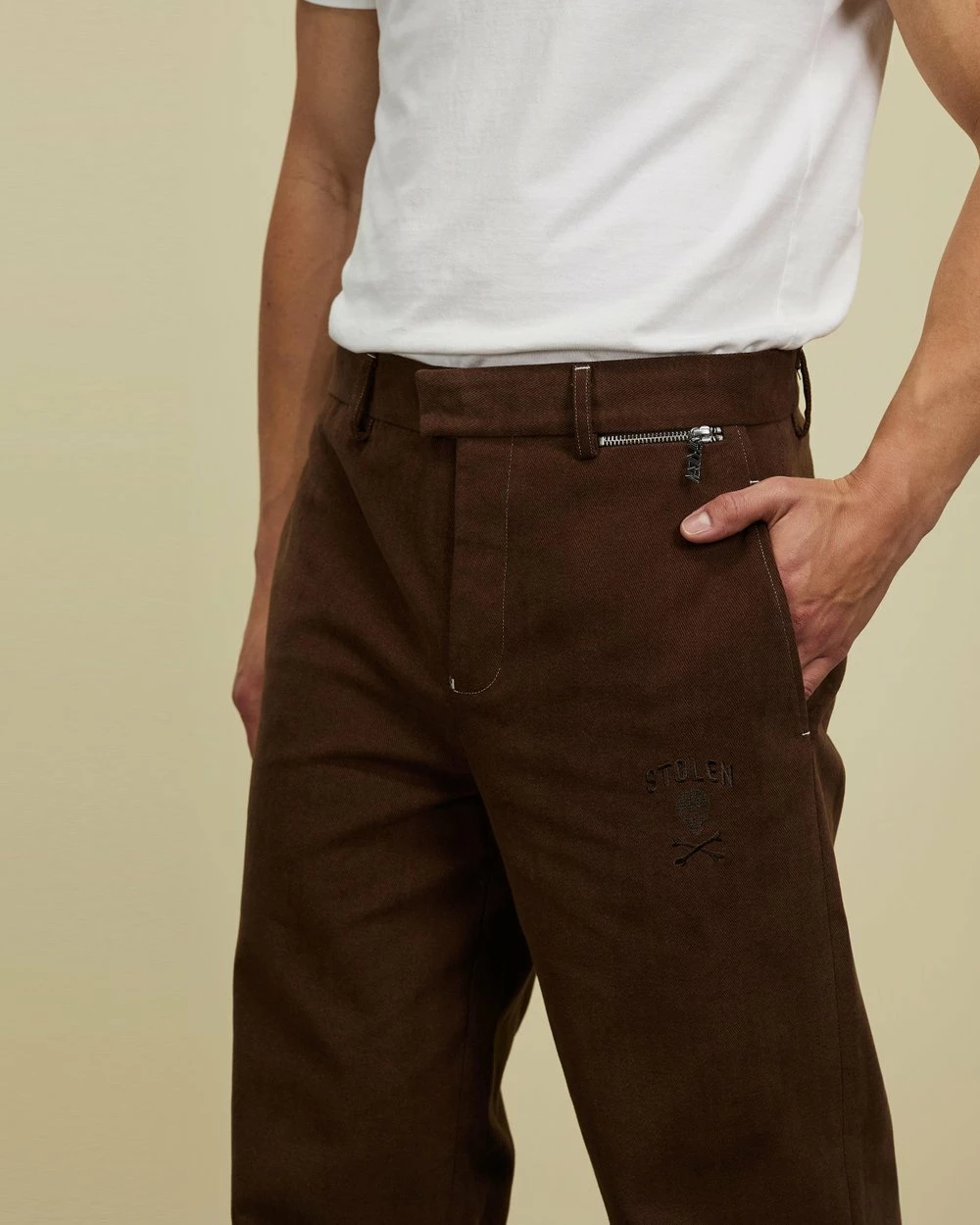 – Belt-looped waistband with hook-and-bar fastening; zip fly