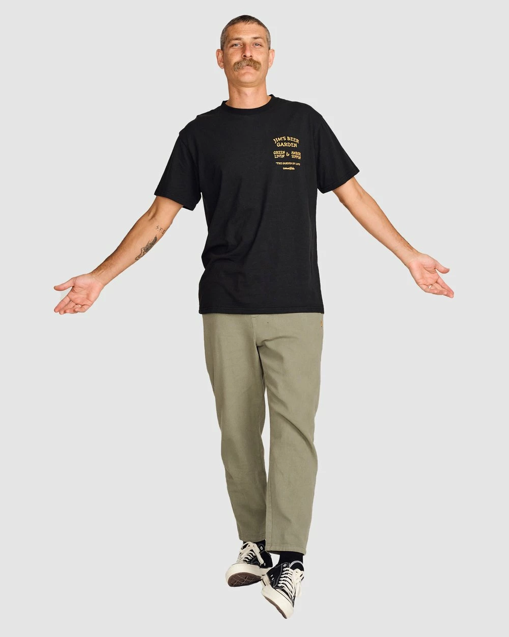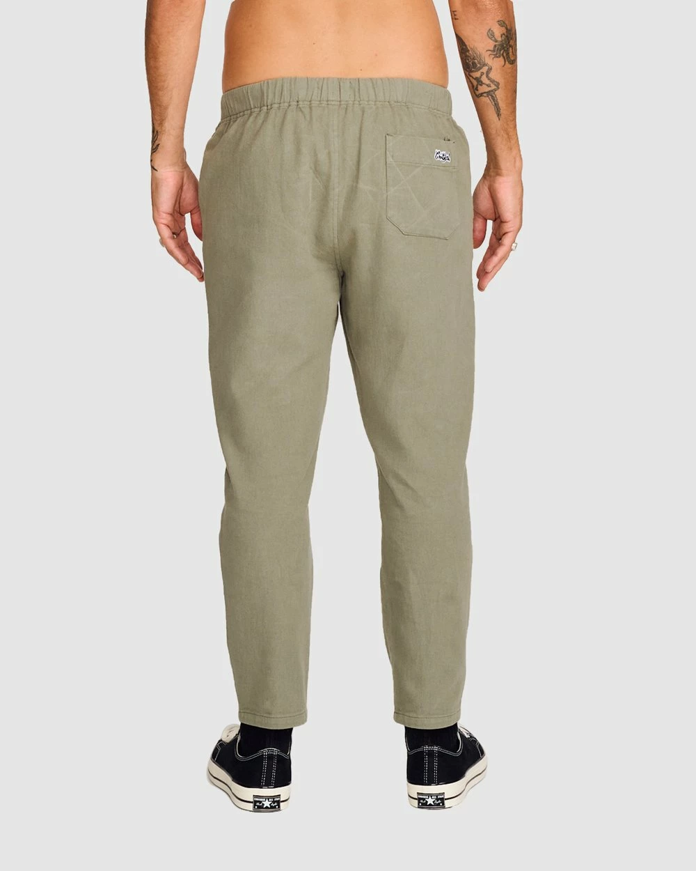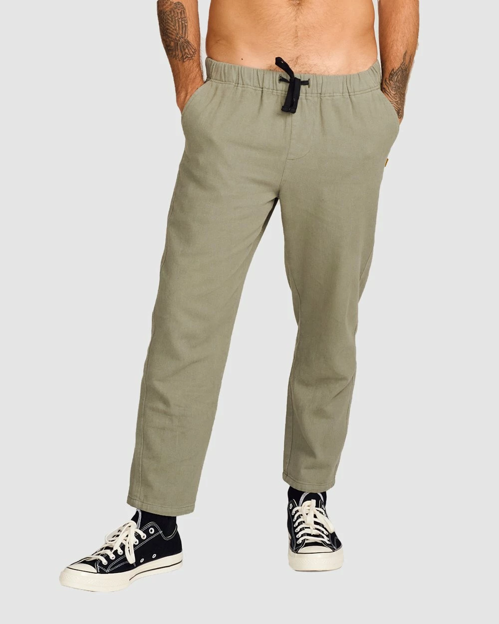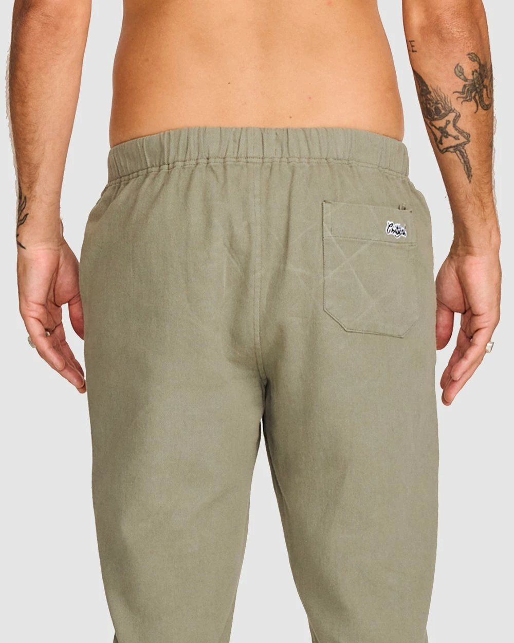 The All Day Twill Pant from The Critical Slide Society is beach pant inspired. An elastic drawcord waist with a slightly tapered leg, longer crotch and a slightly cropped leg length. It’s made from a soft cotton twill.