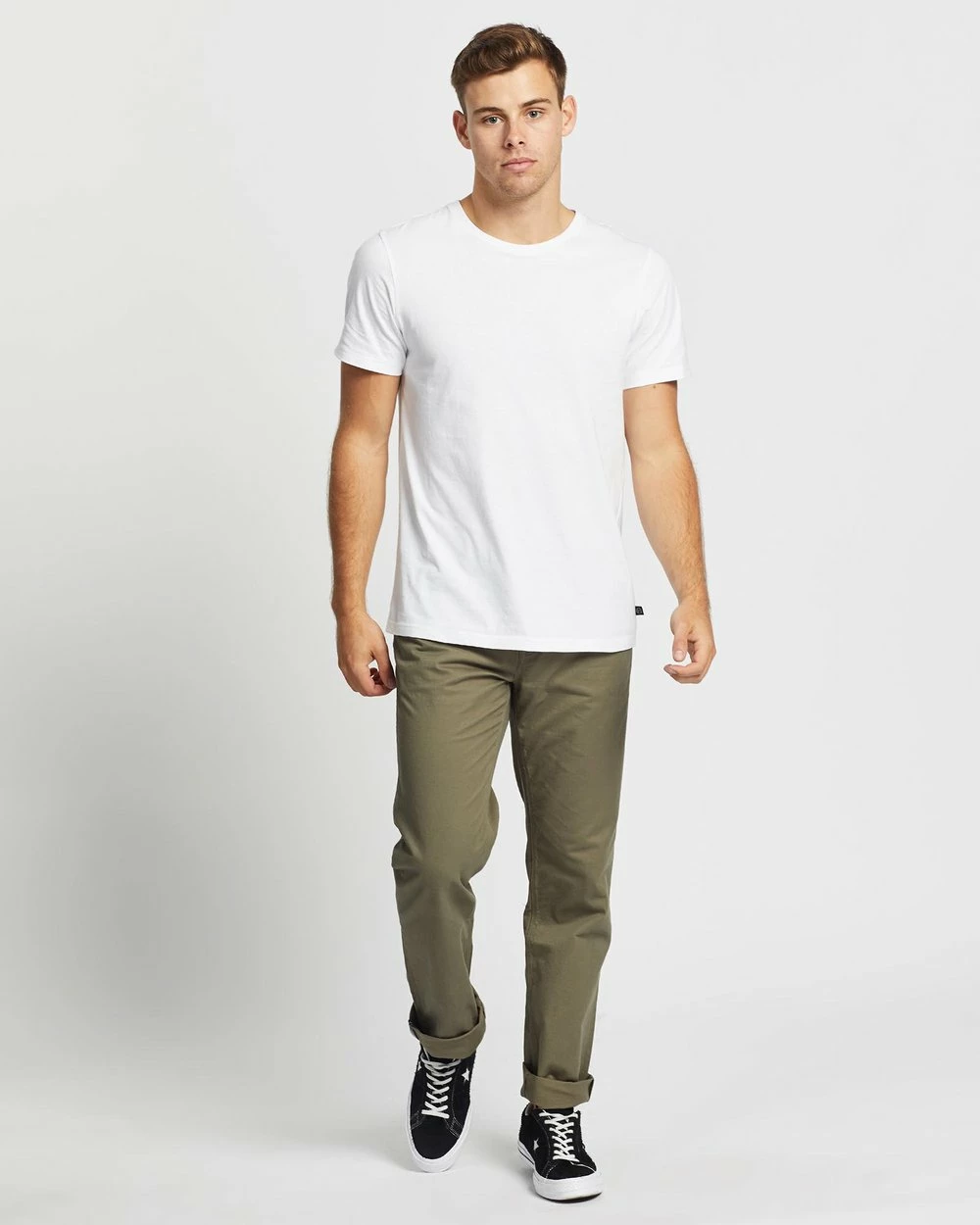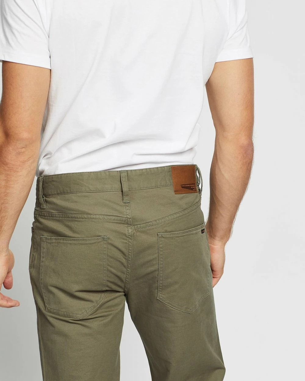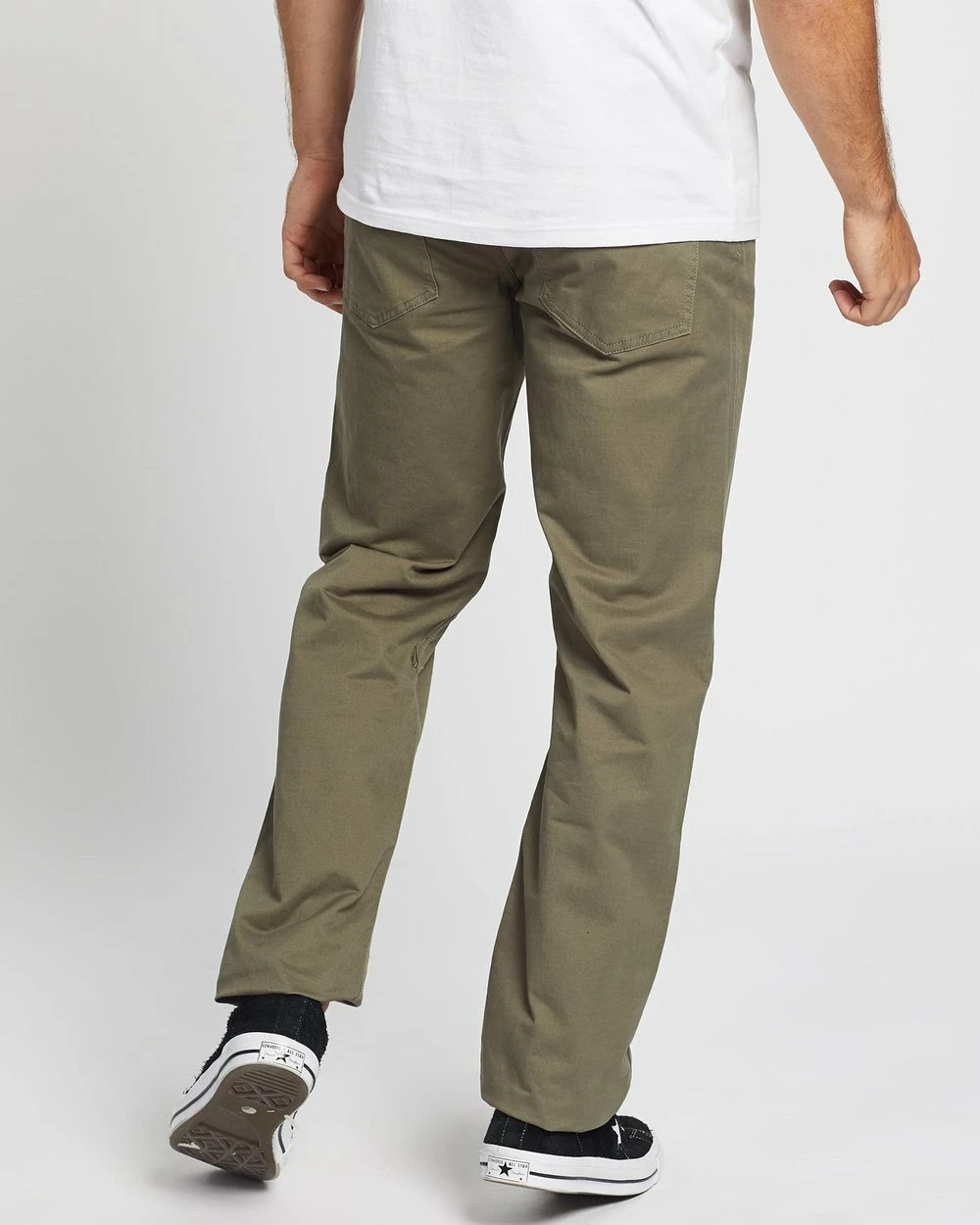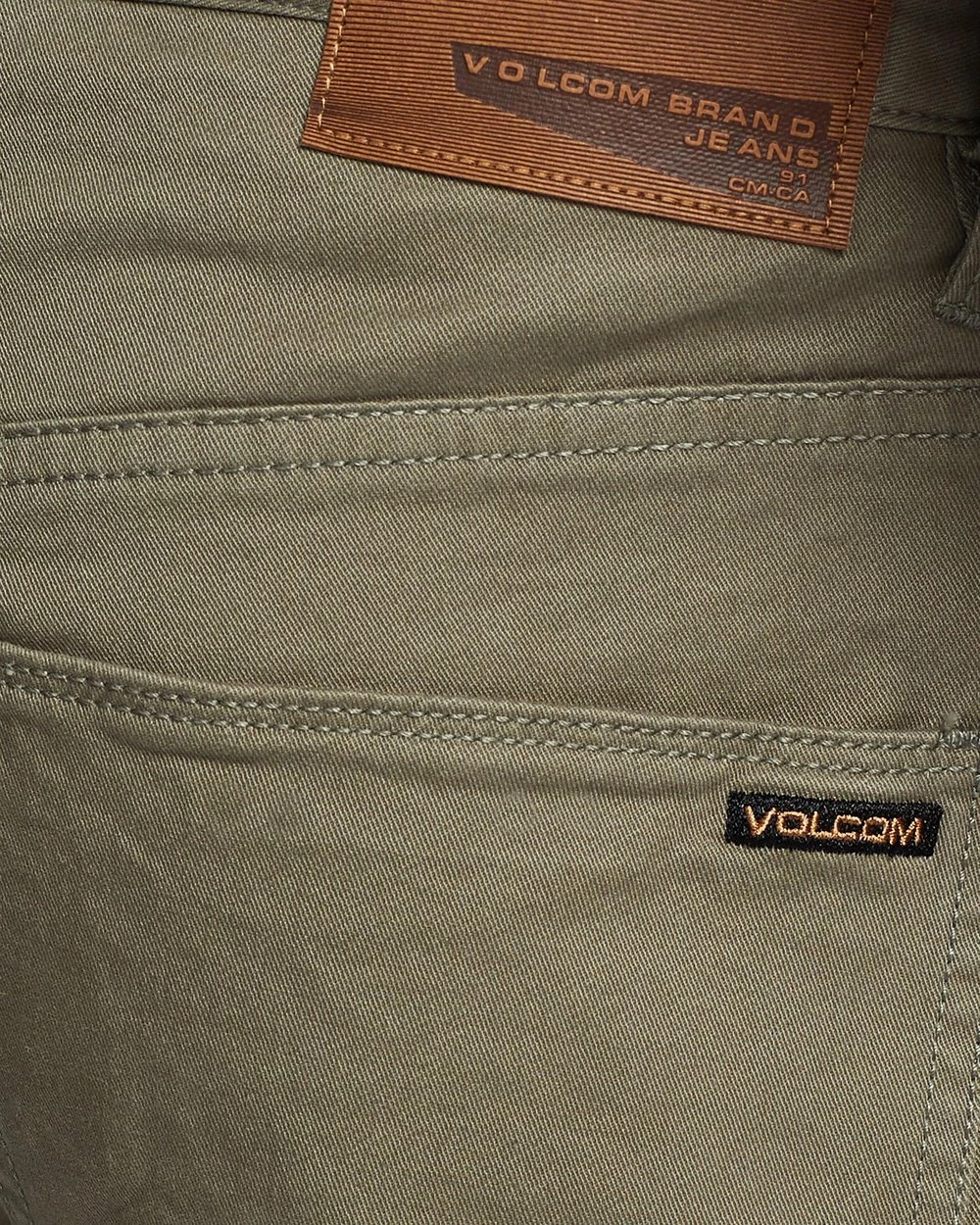 Volcom’s Solver 5 Pocket Modern Fit Twill Pants are cut for a versatile straight leg and finished with a light army green wash.