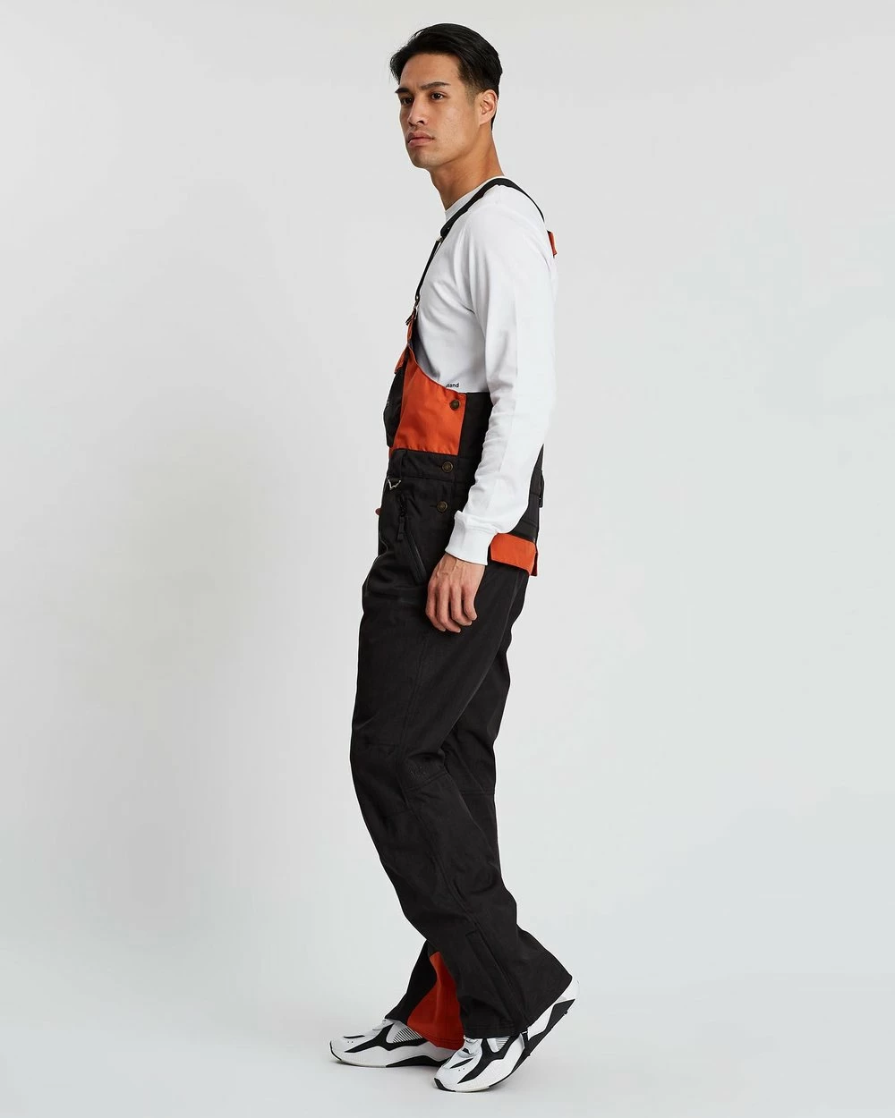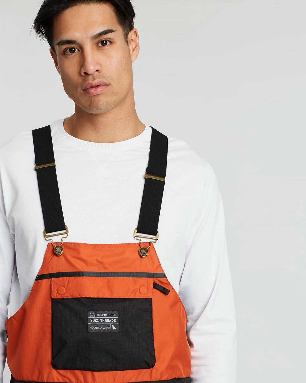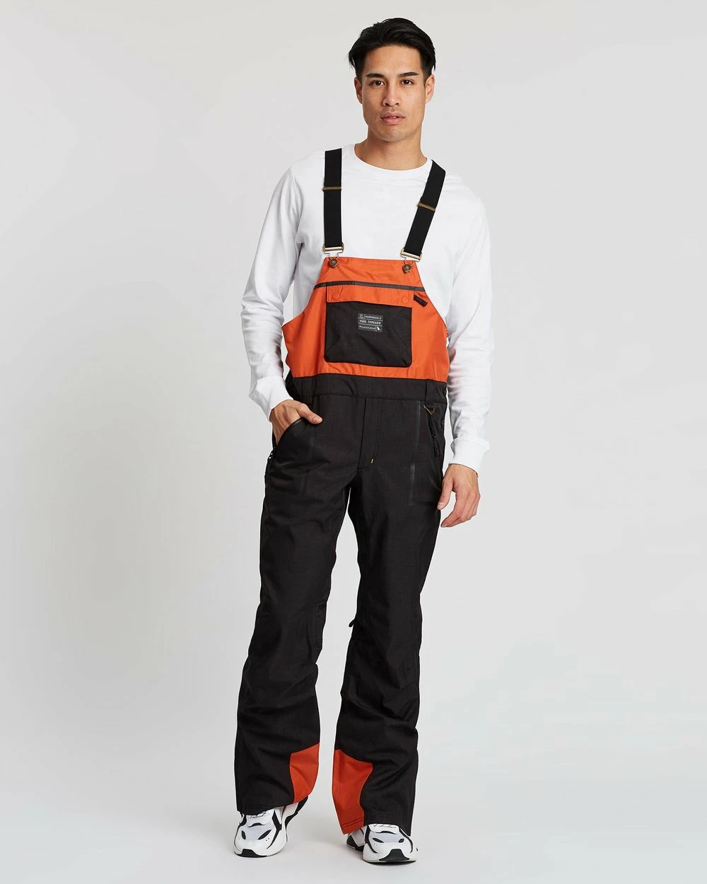– Squared bib front with zip pocket and tonal branded embroidery
